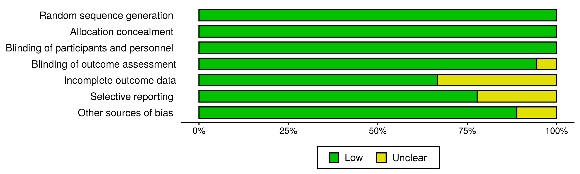 The Cochrane Collaboration’s tool for determining the risk of bias was used for all the studies included in this review.27 The 2 authors integrated the information and summarized the risk of bias associated with the included studies. The majority of studies had a low risk of bias concerning the following domains: blinding of outcome assessment (94%); incomplete outcome data (66%); selective reporting (77%); and other bias (88%). All of the studies presented a low risk of bias (100%) with regard to the random sequence generation, allocation concealment, and blinding of participants and personnel domains (Figure 2). In summary, among the 18 studies assessed for the overall risk of bias, not one study was classified as having a high risk of bias; 11 (61%) studies were considered to have a low risk of bias and 7 (39%) studies had an unclear risk of bias (Figure 3). The scoring of unclear risk of bias was given to 7 studies, as there was not enough information to make a clear judgment concerning the following domains: blinding of outcome assessment; incomplete outcome data; selective reporting; and other bias (Figure 3). A review of the authors’ judgments about each risk of bias domain is presented in Figure 2. Finally, the risk of bias for each study is presented in Figure 3.