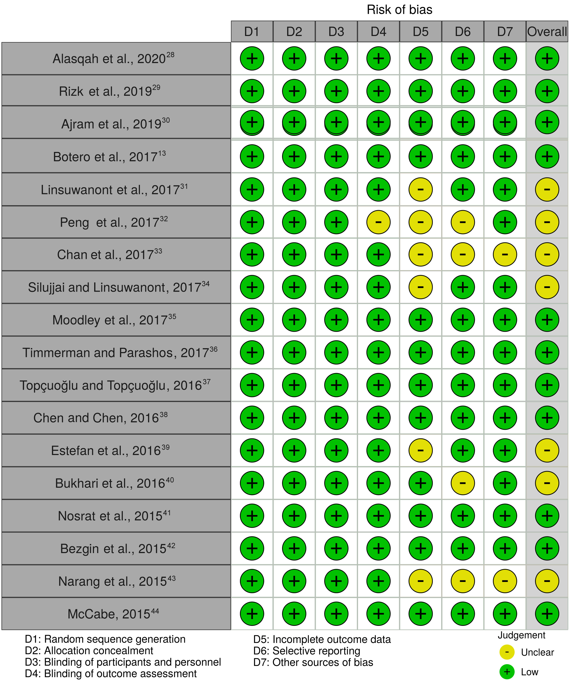 Each domain was assessed as ‘low risk’, ‘unclear risk’ or ‘high risk’. The overall risk of bias associated with each study was evaluated as follows: