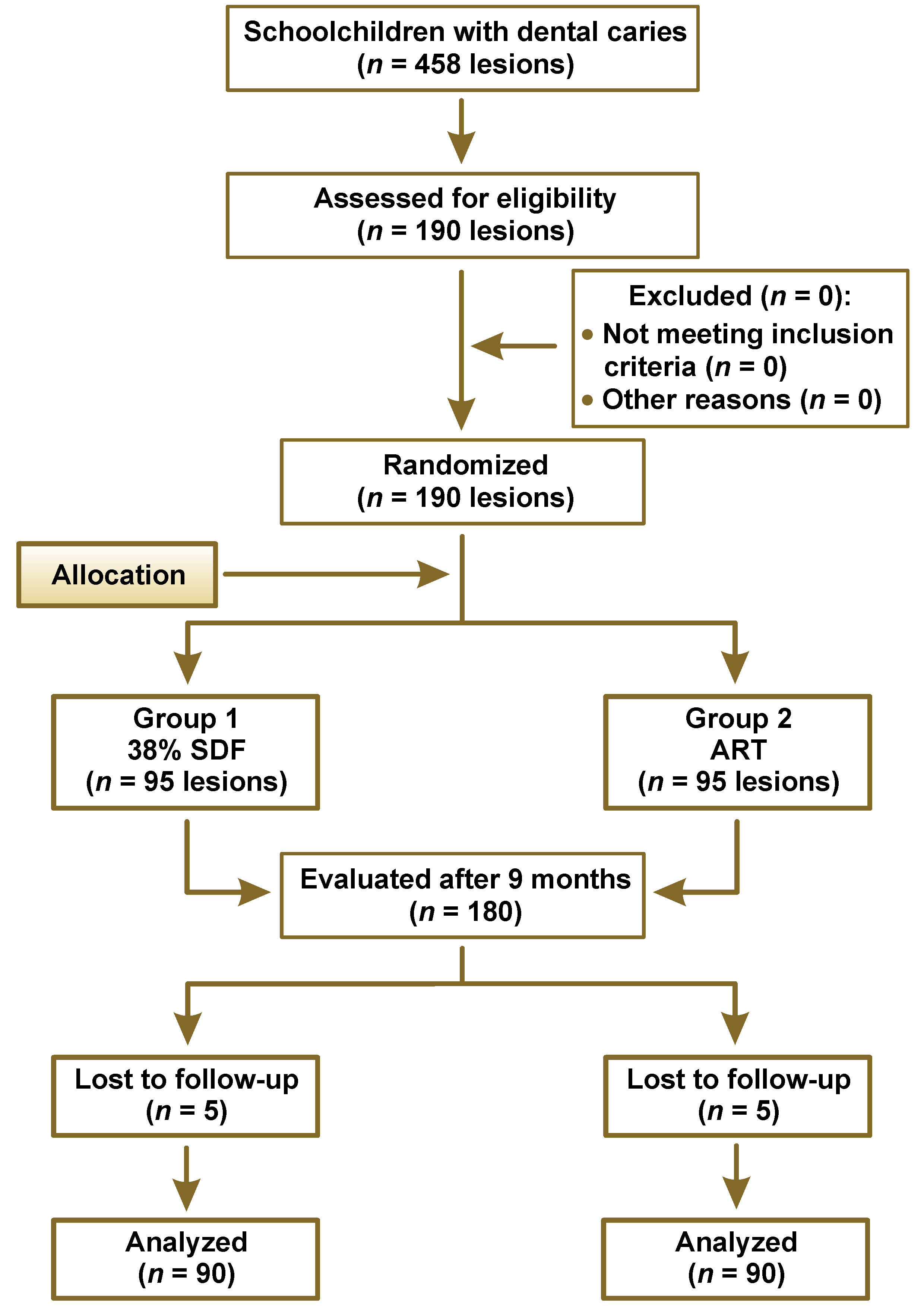 Material and methods. A randomized clinical trial (RCT) using a parallel-group design was conducted among schoolchildren aged 6–12 years. Oral hygiene practices and sugar exposure were recorded at baseline. In the schoolchildren, 190 dental caries lesions were restored using 38% SDF (group 1) or ART (group 2). The χ2 test and the Kaplan–Meier survival analysis were done to assess the 2 treatment modalities. The RCT was carried out and reported in accordance with the CONSORT (Consolidated Standards of Reporting Trials) checklist.