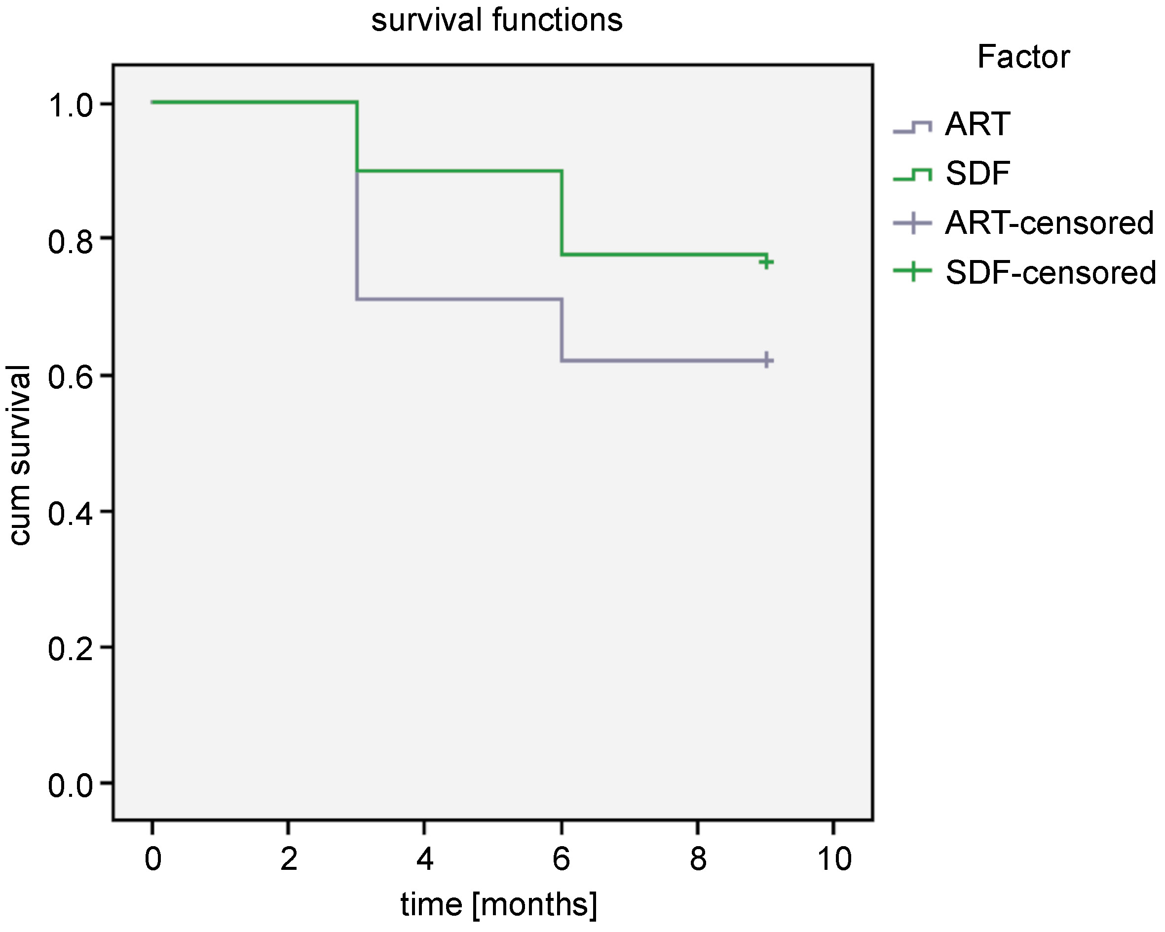 Results. A total of 190 children fulfilled the inclusion criteria and the mean age of the study population was 9.3 ±1.3 years. The majority of the participants brushed their teeth once daily, using a toothbrush, rinsed their mouth after meals and had optimal sugar exposure. In measuring the outcome of the interventions after 9 months, 58.9% of the participants from group 1 had their restorations intact as compared to 47.8% in group 2, and this was found to be statistically significant (p = 0.004). The survival analysis using the log rank test showed 38% SDF to be better in comparison with ART.
