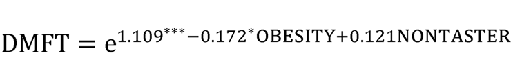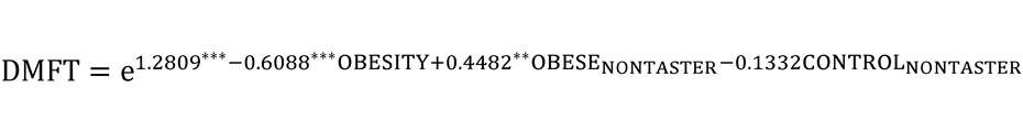 Equation 1, which was created to determine the DMFT/dmft index, depending on the obesity and non-taster dummy variants of the child in the Poisson model analysis, is presented below21: