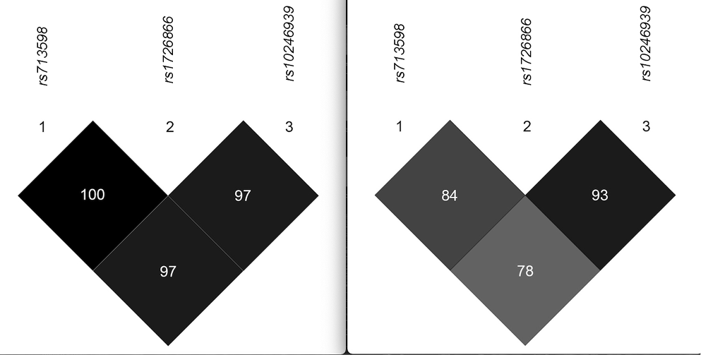 A total of 3 different SNPs of the TAS2R38 gene were evaluated and the linkage disequilibrium (LD) test was performed (Figure 1) to determine the haplotypes of the respondent children (Table 4). Partial tasters were included in the taster group.
