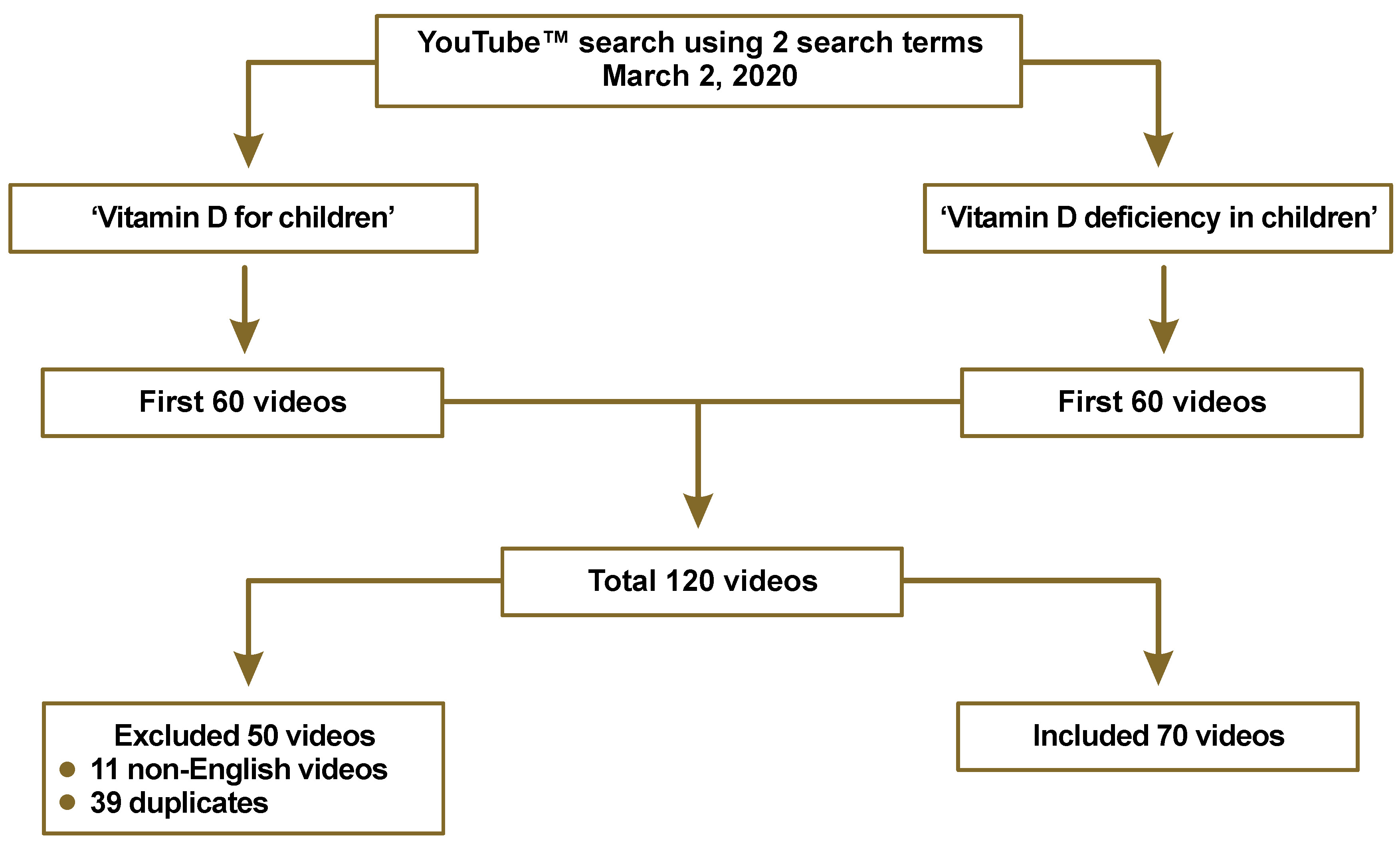 The structured method used in previous studies was systematically implemented in this study to search the contents of YouTube.12, 13, 14 The Google Trends application was used to identify the search terms that are most frequently used on the Internet with regard to the topic discussed in this study.15 In this research, 2 search terms were used, namely ‘vitamin D for children’ and ‘vitamin D deficiency in children’. The search was carried out on March 2, 2020, using YouTube default settings without any filters. A previous study reported that a vast majority of YouTube users went through the first 30 videos multiple times in a day.16 Hence, videos that appeared on the first 3 pages (the first 60 videos) for each search term were included in the study. Meanwhile, the layout of the site was changed. Therefore, the first 60 videos that appeared on the screen for each term were counted and explored. These 120 videos were downloaded and briefly scanned to exclude irrelevant videos, videos that were not in English and duplicates with regard to the 2 search terms before further evaluation.