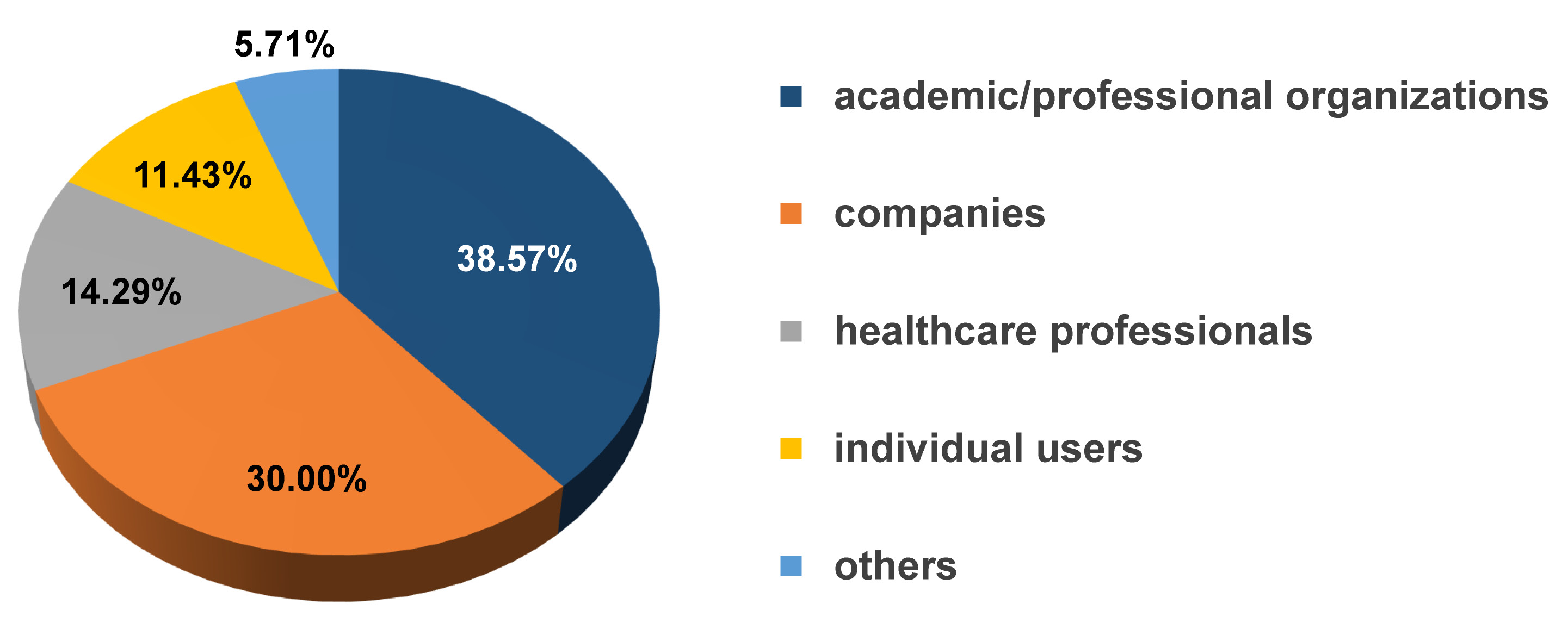 The descriptive statistics of the videos are presented in Table 3. The median duration of the videos was 2.75 min. The total number of views was 6,479,549 with a median viewing rate of 2.25 views/day. The median distribution of interaction with viewers was 17 likes and 1 dislike with a median viewer’s interaction index of 0.53. The median content score was 4 and the median GQS score was 3. Most of the viewed videos were uploaded by academic institutions and professional organizations (n = 27; 38.57%), whereas other videos were uploaded by companies, healthcare professionals, individual users, and others (Figure 2).
