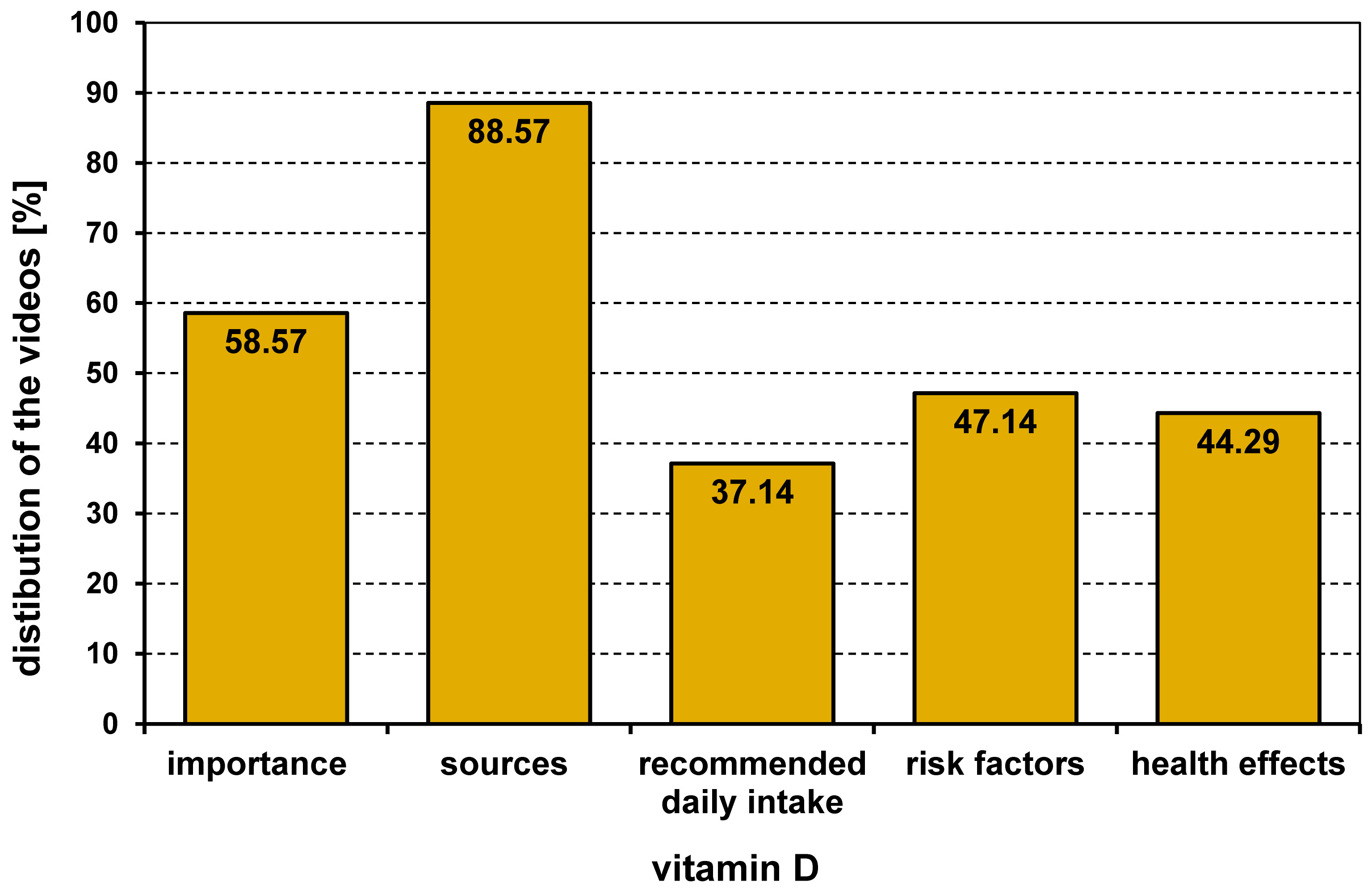 A mild lack of vitamin D may not cause symptoms, but can result in tiredness, and general aches and pains. A more severe lack can cause serious problems, such as rickets in children and osteomalacia in adults.23 Nevertheless, less than half of the videos (n = 31, 44.29%) highlighted the health effects of vitamin D deficiency, such as the impaired mineralization of bone.