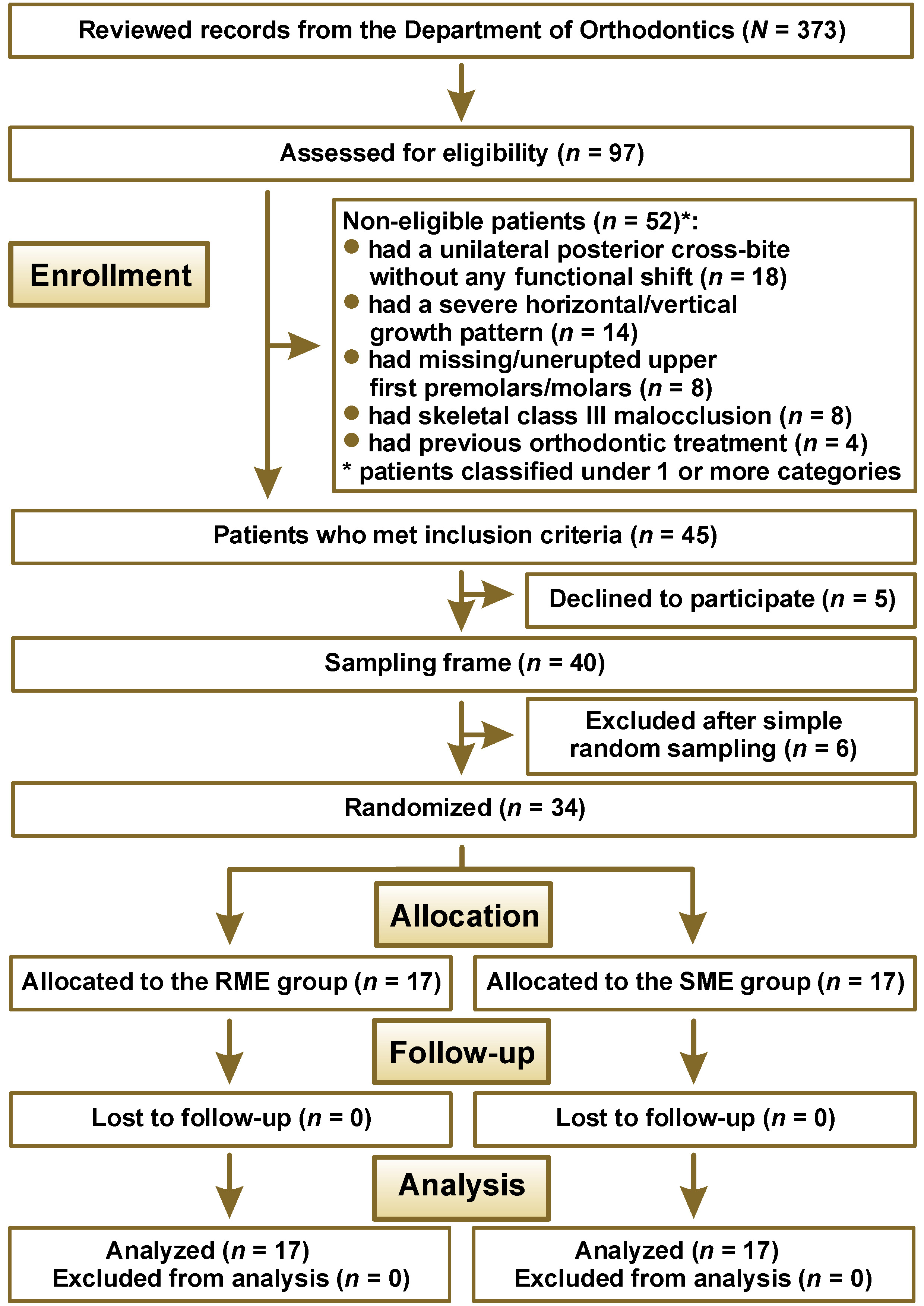 The sample size was determined using Minitab®, v. 17 (Minitab, State College, USA), assuming a 2-millimeter difference in the maxillary basal width between the 2 groups (RME and SME) as clinically significant. The variability of this measurement was about 2.2 mm in a previously published study.5 Using the independent-samples t tests with a significance level of 5% and a power of 80%, 16 patients were required in each group. One patient was added to each group to avoid any potential attrition, bringing the total number in each group to 17 patients.