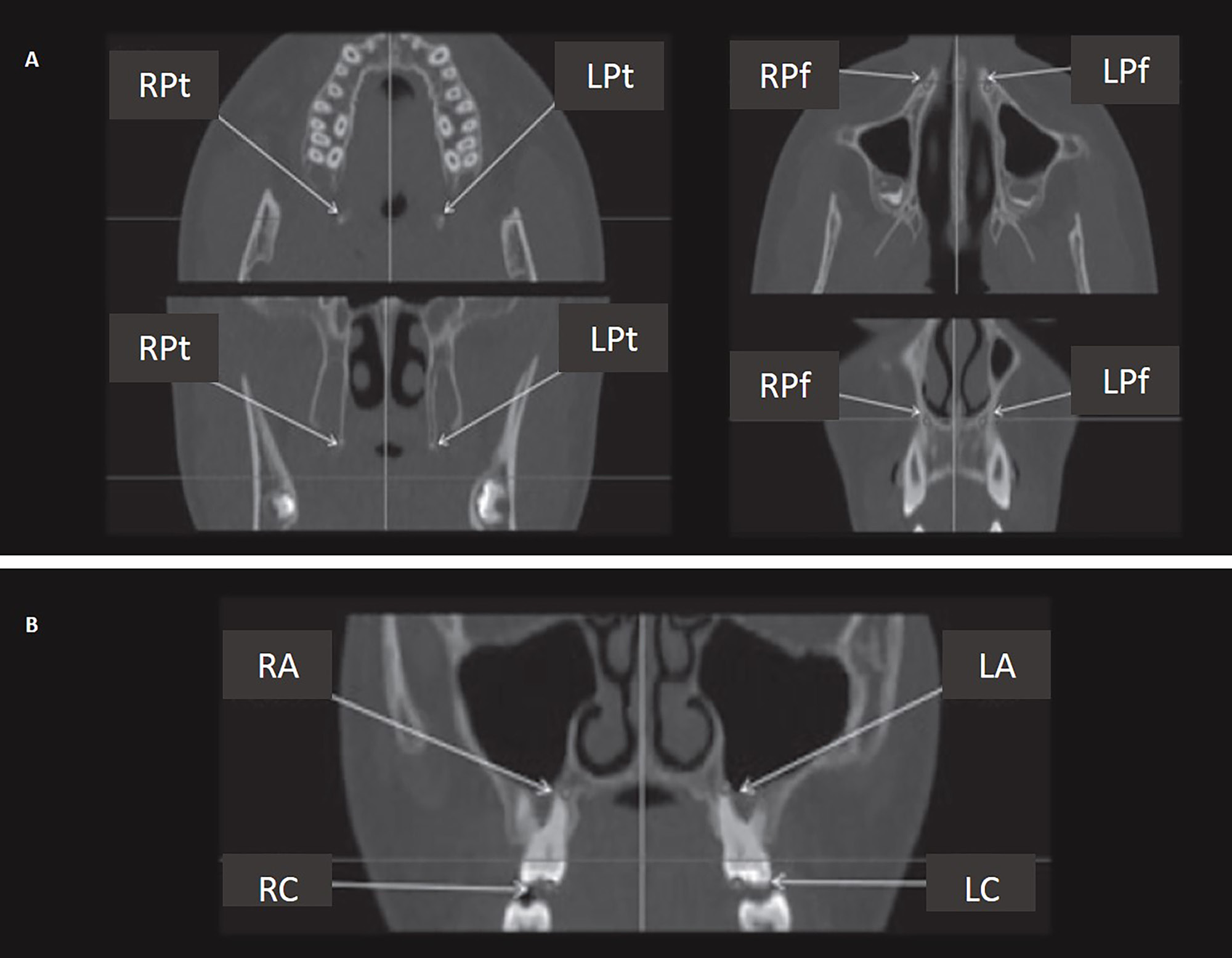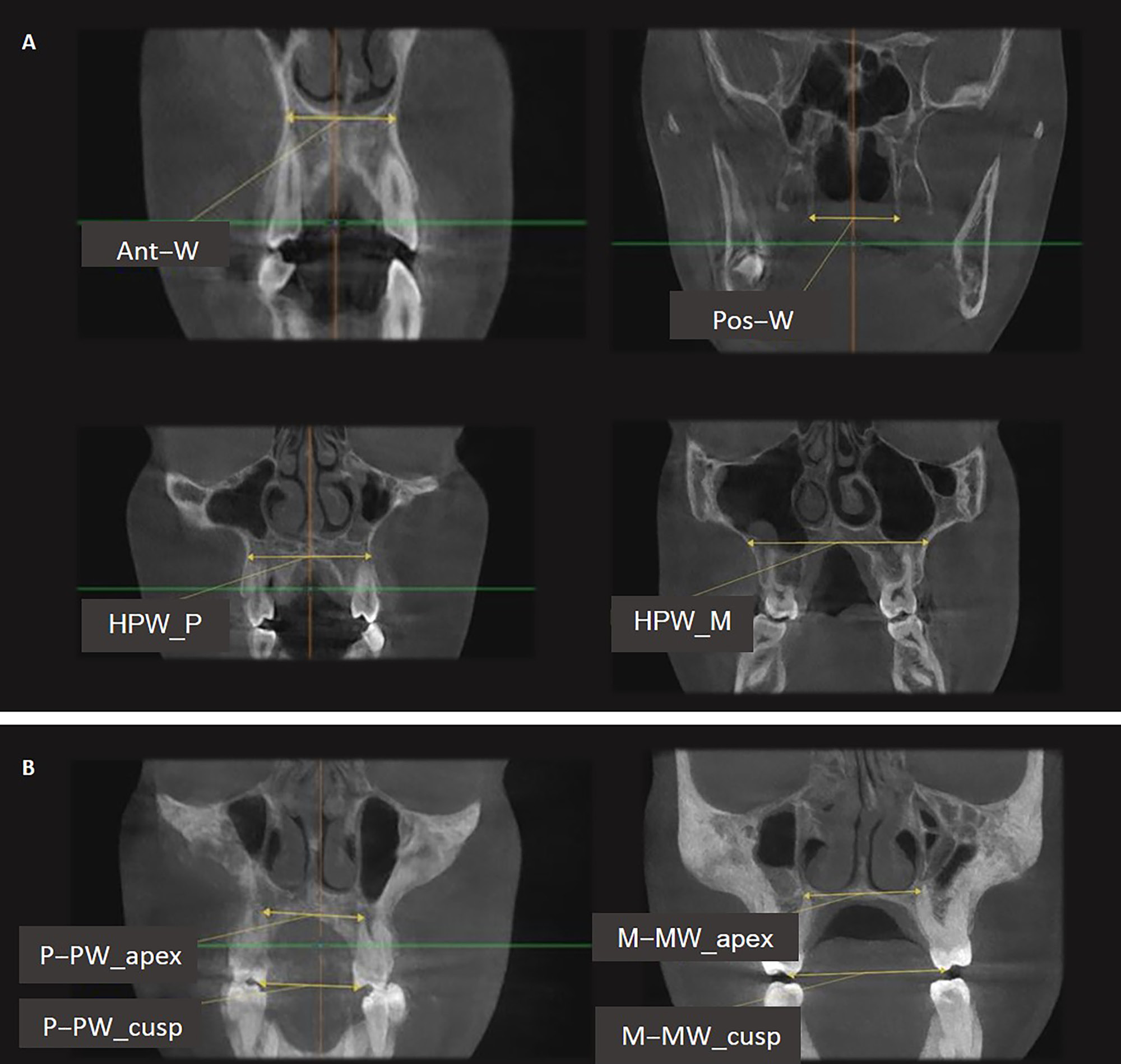 To ensure the appropriate position of the patient’s head, it was oriented in such a way that the Frankfurt plane was parallel to the horizon. The imaging system SCANORA® 3D (Soredex, Tuusula, Finland) was used (amperage: 12.5 mA; voltage: 90 kV; voxel size: 0.25 × 0.25 × 0.25 mm3; mean scanning time: 20 s). Two CBCT images were taken at the following time points: before expansion (T1); and 3 months after expansion and the removal of the appliance in the RME group, and 1 month after expansion and the removal of the appliance in the SME group (T2). Eight landmarks were identified on CBCT images: 4 skeletal landmarks (right/left pterygoideous point and right/left piriform point); and 4 dental landmarks (right/left root apex and right/left cusp tip) (Table 1).5 Four skeletal measurements were made: anterior palatal width; posterior palatal width; palatal width at premolars; and palatal width at molars (Table 1).5, 15 Six dentoalveolar measurements were made: inter-premolar width at the root apex; inter-premolar width at the cusp tip; inferred premolar tipping; molar width at the level of apices; molar width at the level of cusps; and inferred molar tipping (Table 1).5 Figure 3 and Figure 4 demonstrate the landmarks and measurements used. The definitions were derived from studies by Martina et al.5 and Lin et al.15 Both ‘inferred’ premolar and molar tipping measurements were given in millimeters (i.e., they were linear measurements), although they indirectly represented the amount of change in the buccolingual inclination of premolars and molars.5