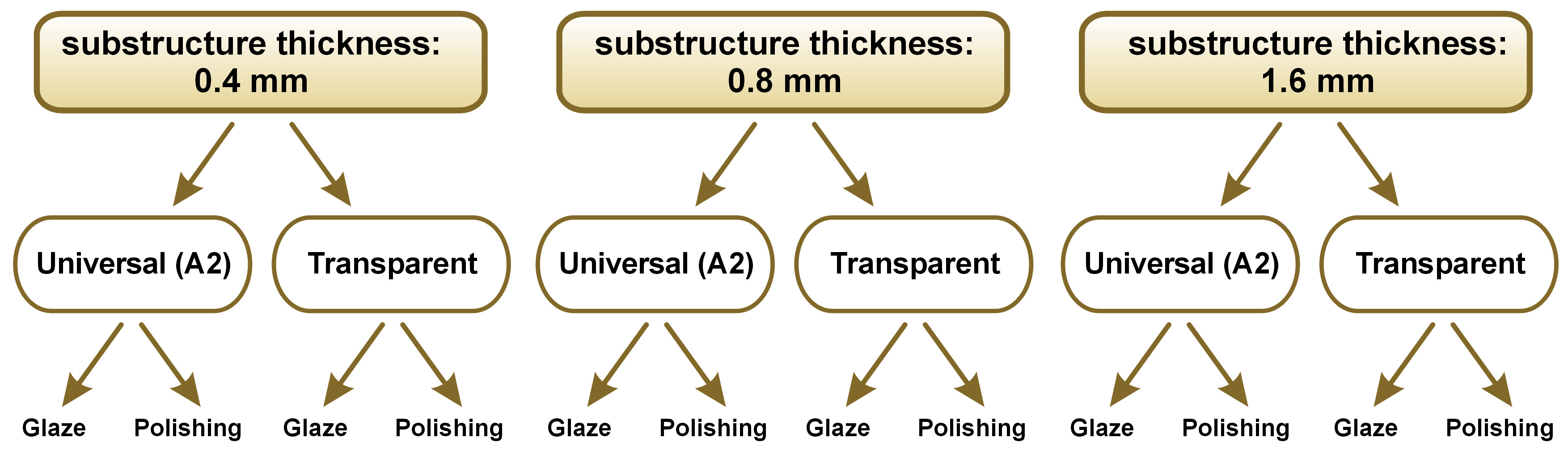 For all parameters, the null hypothesis was accepted. A 1.6 mm substructure ceramic thickness met the clinically acceptable color change when considering the three analyzed backgrounds. Reducing the substructure thickness to 0.4 or 0.8 mm caused a greater color change than the clinically acceptable value, especially in subgroups with polishing and gray backgrounds (Table 2). However, 0.4 mm and 0.8 mm substructure thicknesses and glazed test specimens generally resulted in clinically acceptable color change values with each background (Table 1, Table 2, Table 3). These results indicate that when clinically low substructure thickness is required, it will be clinically more appropriate to use glaze as a surface finishing process.