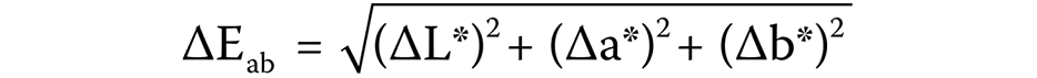 Color measurements were made before and after the cementation of all ceramic test specimens to the resin composites. A spectrophotometer device (CR-321 Chroma Meter, Konica Minolta, Tokyo, Japan) was used for color measurements with black, gray, and white backgrounds. For the evaluation of color measurement, the CIE L*a*b* color system, which was standardized by the International Commission on Illumination, named Commission internationale de l’éclairage, was used. The CIE L*a*b* system defines color in 3 axes: L*; a*; and b*. The L* axis indicates the degree of lightness, darkness, brightness, or black/white – pure white is 100 L*, while pure black is 0 L*. The a* and b* axes represent the chromatic properties of the color. The a* value indicates the red-green ratio of the color and the b* value indicates the yellow-blue ratio. If the a* value is positive, it is red; if it is negative, it is green. If the b* value is positive, it represents yellow; and if it is negative, it represents blue. The color difference is defined by ∆E. In the calculation of ∆E, the following formula is used (Equation 1):