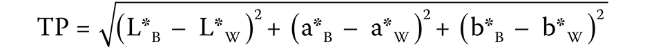 A spectrophotometer (CR-321 Chroma Meter; Konica Minolta, Tokyo, Japan) was used to measure the light transmittance of the test specimens. Light transmittance was measured using white and black backgrounds. The light transmittance values were calculated using the following formula (Equation 2):