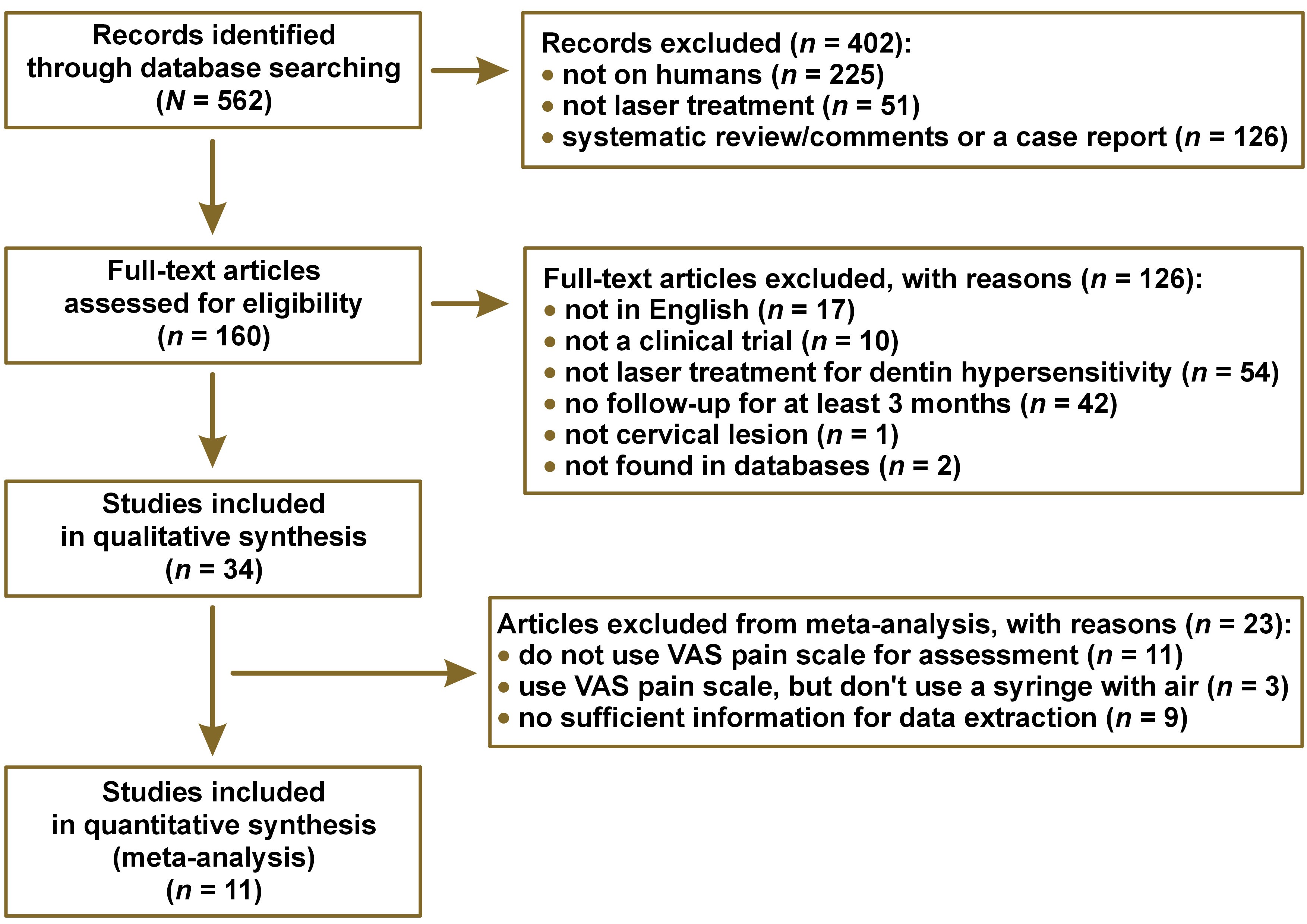 The full text of all eligible articles was subject to the following exclusion criteria: (1) non-randomized clinical trials; (2) not written in the English language; (3) not in permanent teeth; (4) studies without laser therapy treatment; (5) studies that did not have at least 3 months of follow-up after baseline; and (6) studies without sufficient information for data extraction.