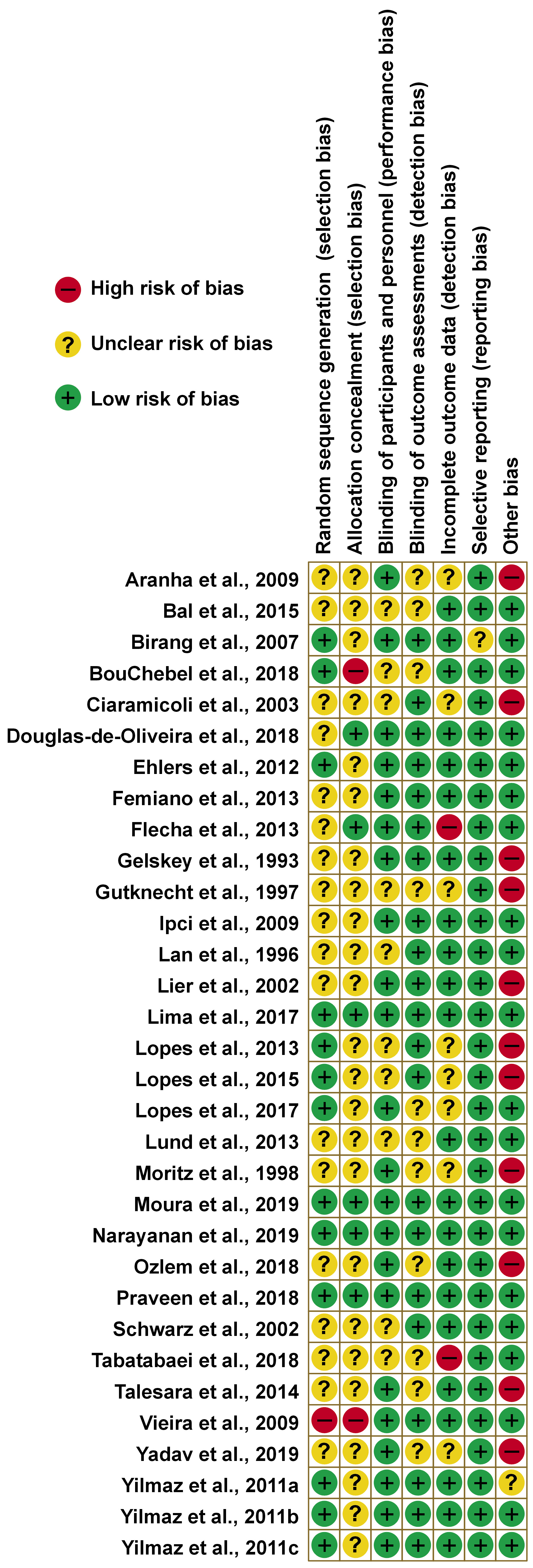 Also, 34% had a high risk of bias concerning the other bias items, as they varied in the number of laser applications administered to the same patient or indicated the use of fluoride-free toothpaste during treatment. In addition, some had a flaw in the methodology that the authors deemed important.