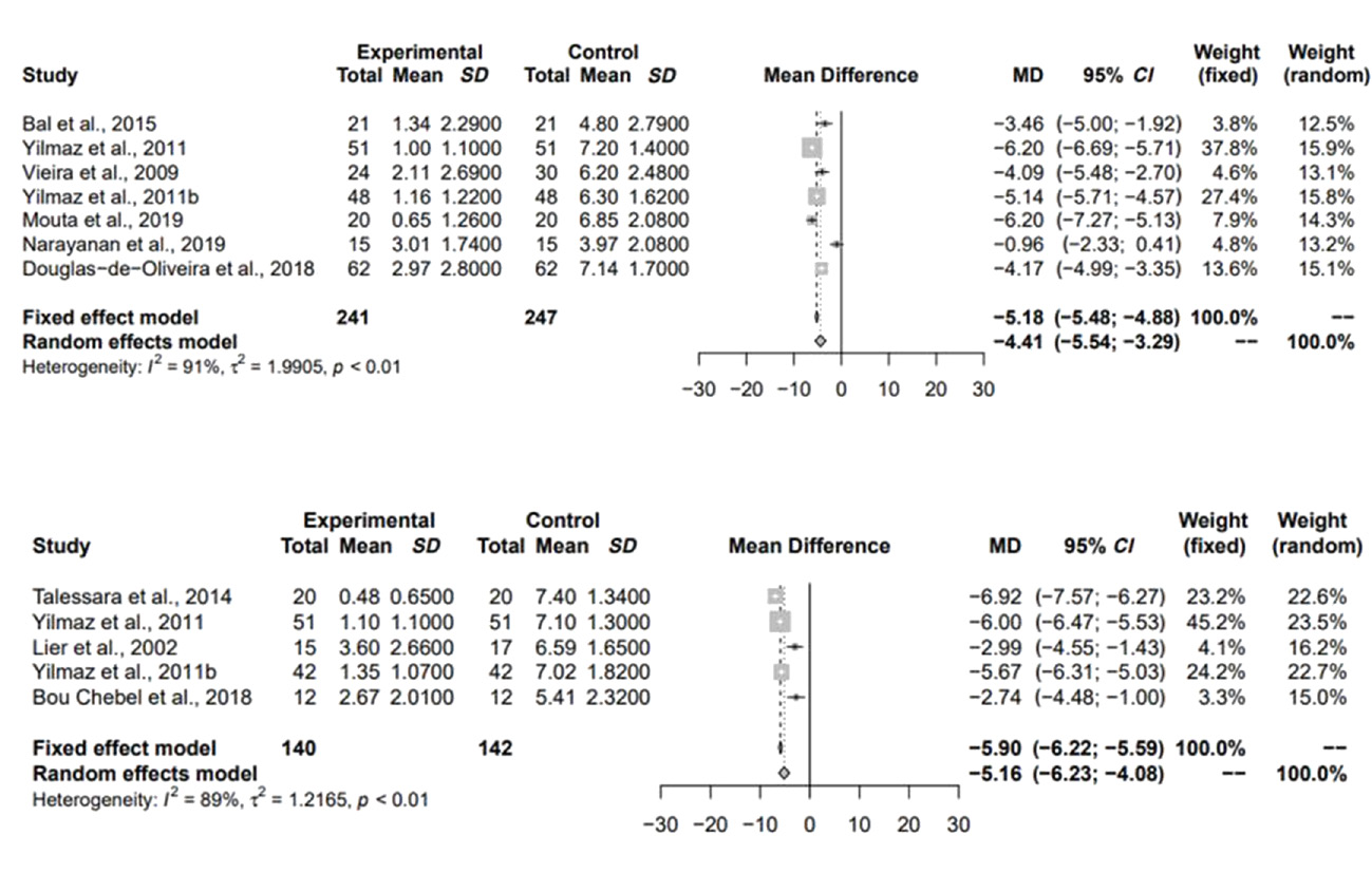 Only the articles that used the VAS with a syringe of air to assess DH were used for the meta-analysis to standardize the patient’s pain collection. The groups were separated between high and low-intensity lasers using the power described in watts (W) or milliwatts (mW) to perform the meta-analysis separately.