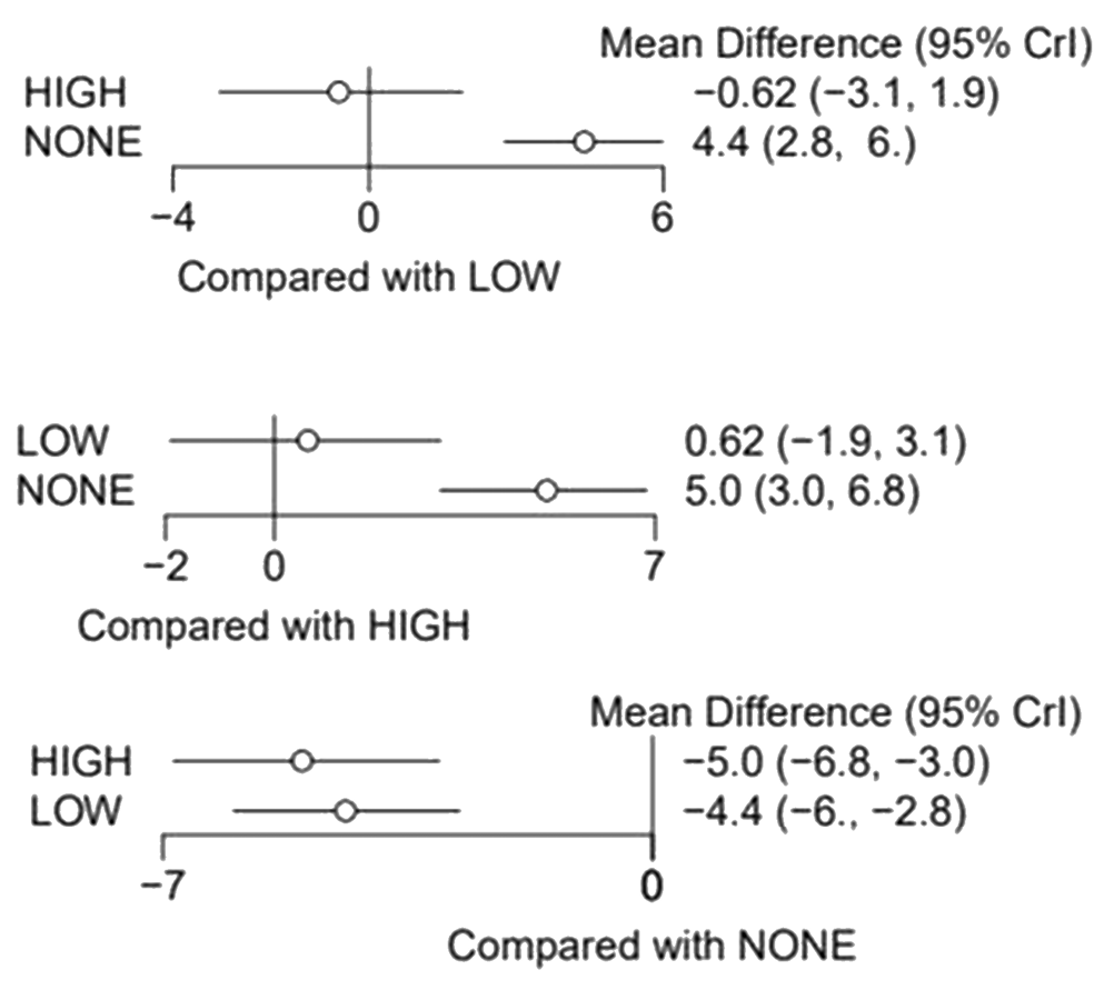 Through indirect comparisons, it was observed that the high-power laser showed a greater tendency to reduce pain levels after 3 months of treatment when compared to the low-power laser, but without a statistically significant difference (Table 3 and Figure 5). Indirect comparisons did not influence the results for low-power versus no treatment and high-power versus no treatment. In that way, there was no inconsistency.