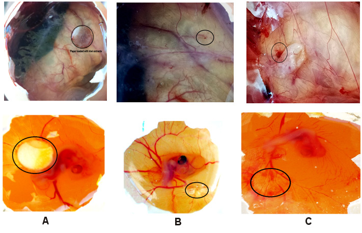 The chicken chorioallantoic membrane (CAM) bioassay was used to evaluate the potential toxicity and pro-angiogenic influence of the ethanolic kiwifruit extract at the vascular level of CAM.15 Fertilized white Leghorn chicken eggs were purchased (Tamil Egg Hatchery, Chennai, India) and incubated in a Multiquip Incubator (E2) (Multiquip Inc., Cypress, USA) at 37°C and 60% humidity for 24 h. The egg tray was automatically tilted at a 450-degree angle every 30 min to mimic natural processes. A small window was made in the shell on the 5th day of the chick embryo development under aseptic conditions, and sterile Whatman™ filter paper disks containing 10 µL of PBS and the ethanolic kiwifruit extract at different concentrations were carefully placed onto the CAM of the eggs. The test compound was prepared at concentrations of 10 μg/mL, 50 μg/mL and 100 μg/mL in 0.2% DMSO. A DMSO control was carried out simultaneously for the comparison with the angiogenic activity of the ethanolic extract. The window was re-sealed with adhesive tape, and the eggs were incubated for 48 h. The windows were re-opened after 48 h of incubation, which was the 8th day of the chick embryo development, and close-up photographs were taken to capture the images of CAM. The images were analyzed for the changes in the angiogenesis process induced by the test compound. All experiments were conducted in duplicate.19