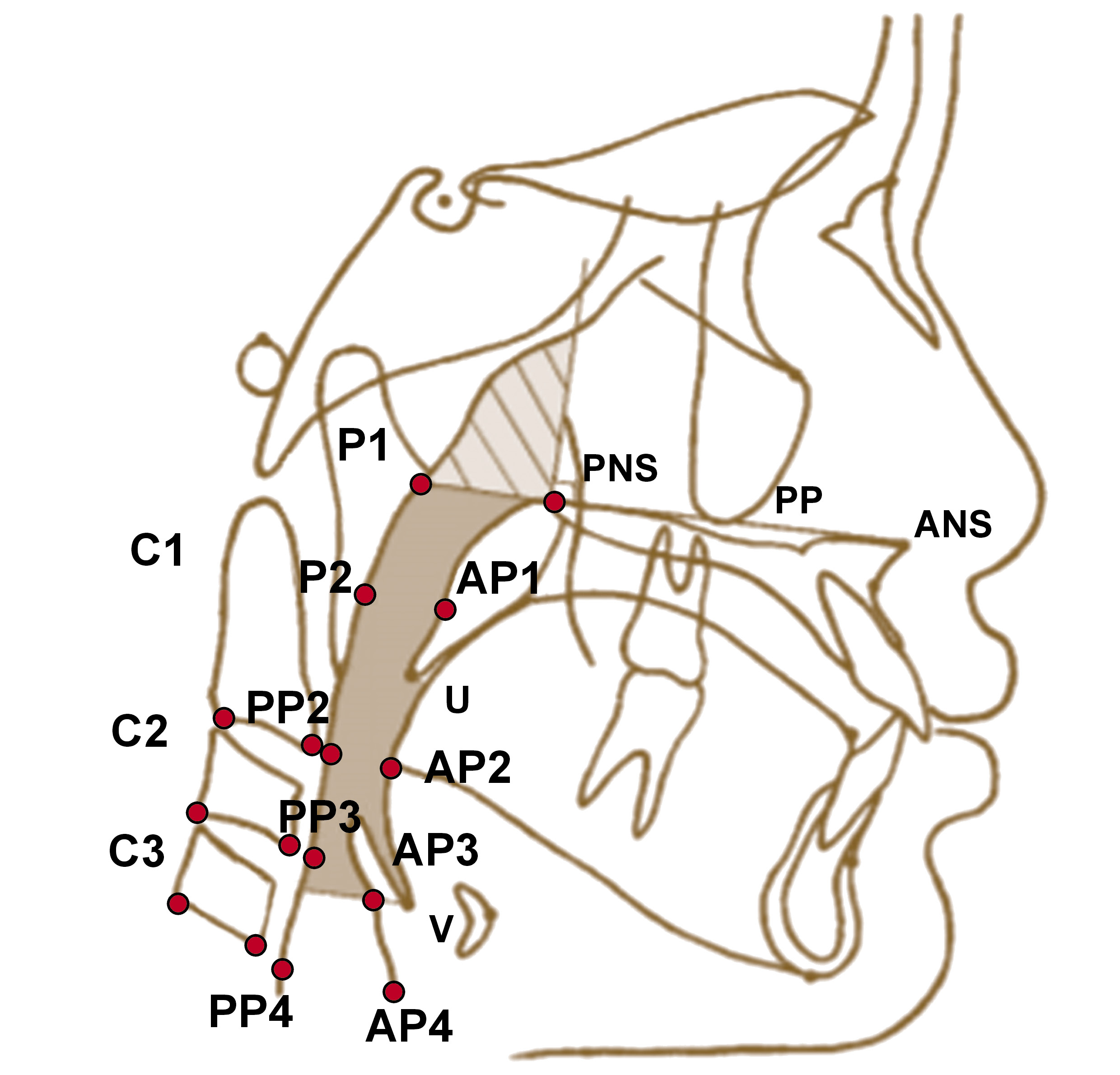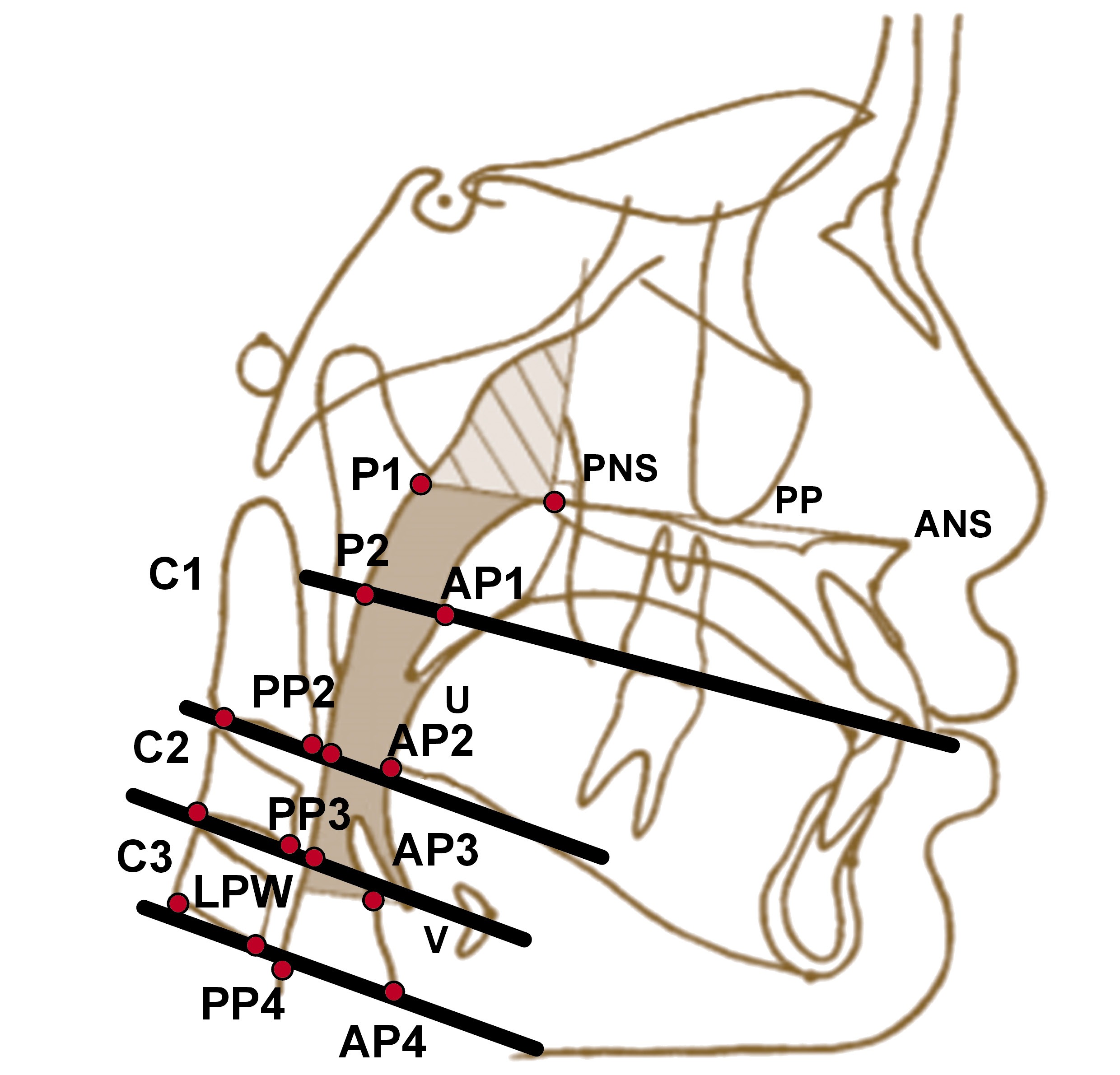 Lateral cephalograms are commonly used to assess the airway dimensions, as the skull is in a fixed position, and the patient is conscious and can maintain a natural head position. Thus, lateral cephalograms can be used reliably for assessing changes in skeletal and soft tissue structures.12, 24 However, lateral cephalometry provides two-dimensional (2D) images of three-dimensional (3D) structures.20 The images are sharp in the midsagittal plane; nonetheless, transverse plane distances cannot be accurately measured. Thus, lateral cephalometry cannot provide precise information on the airway width. Also, lateral cephalometry has limitations with regard to measuring the posterior airway space. To overcome such limitations, cone-beam computed tomography (CBCT) or magnetic resonance imaging (MRI) can be used.14 However, such imaging modalities should only be requested by physicians when medically indicated. Considering the retrospective design of this study, the available lateral cephalograms of the patients were retrieved from the archives and evaluated, as they are still commonly used for linear airway measurements.14 The technique described by Kinzinger et al.14 was adopted for the measurements in this study. Also, as the posterior border of the tongue cannot be easily detected on lateral cephalograms. The index described by Rose et al.25 was used for assessing the airways at the level of OP.