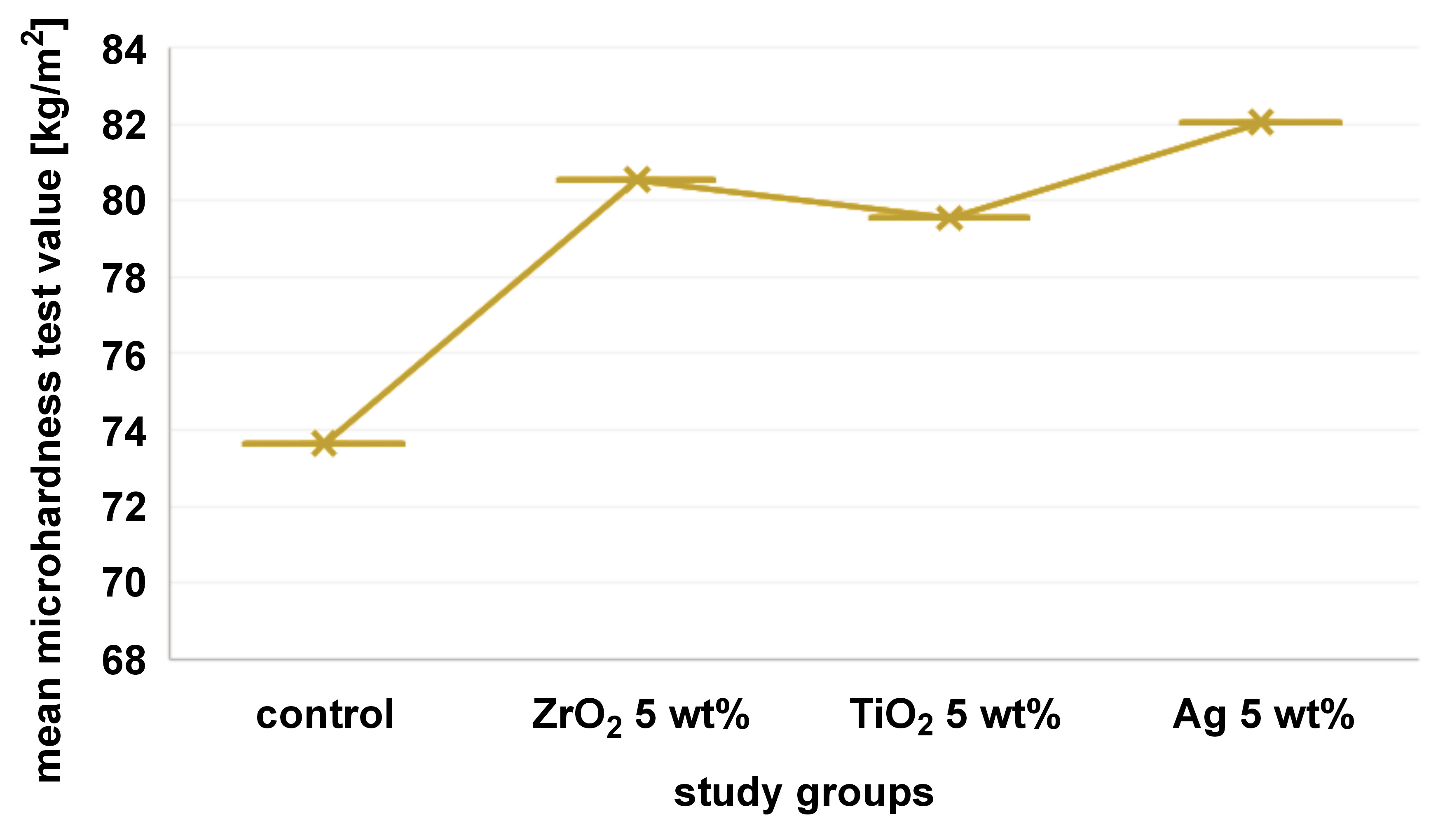 According to ANOVA, the microhardness values showed a highly significant difference (p < 0.01) for the specimen groups containing 5 wt% ZrO2, TiO2 and Ag NPs (Table 2, Figure 1). Among the 4 test groups, the highest mean microhardness value was found in the PMMA group containing 5 wt% Ag NPs (82.05 ±3.60 kg/m2), whereas the control group represented the lowest mean microhardness value (73.65 ±3.04 kg/m2).