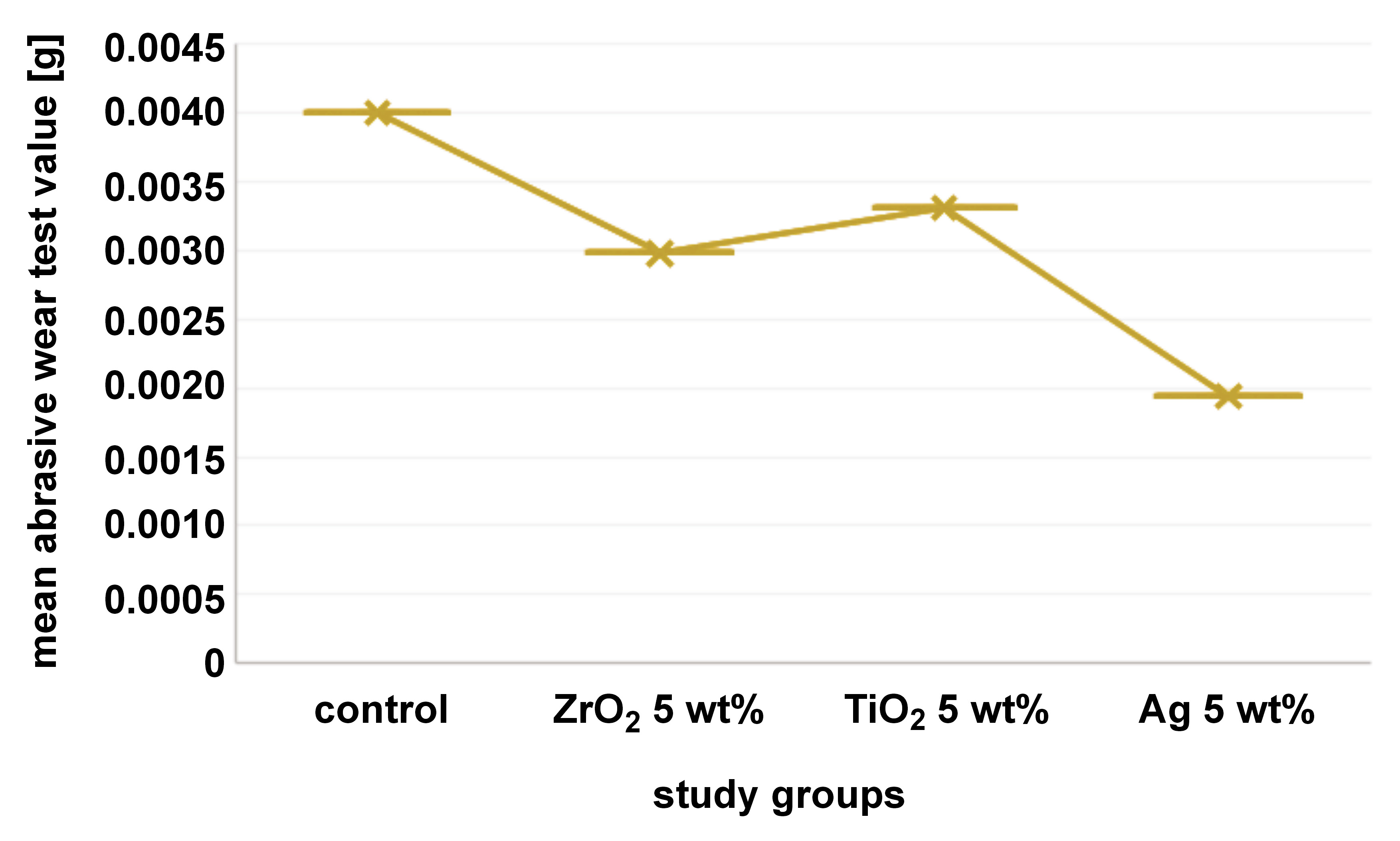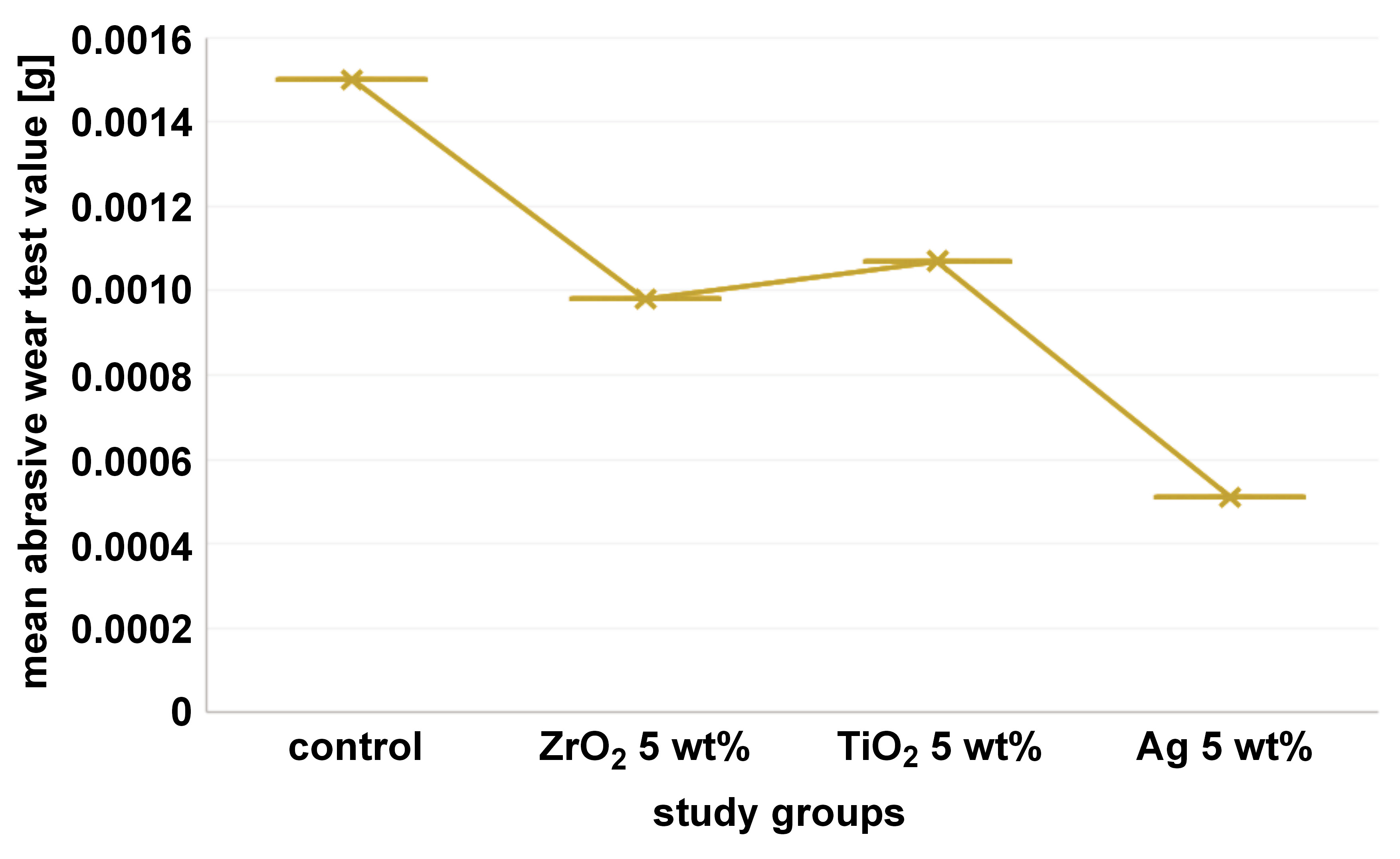 As presented in Table 4 and Figure 3, there were highly significant differences in the mean wear values after 5,000 cycles between all test groups (p < 0.01). The highest mean wear value was observed in the control group (0.00400 ±0.00124 g), while the lowest for the Ag NPs group (0.00194 ±0.00030 g).