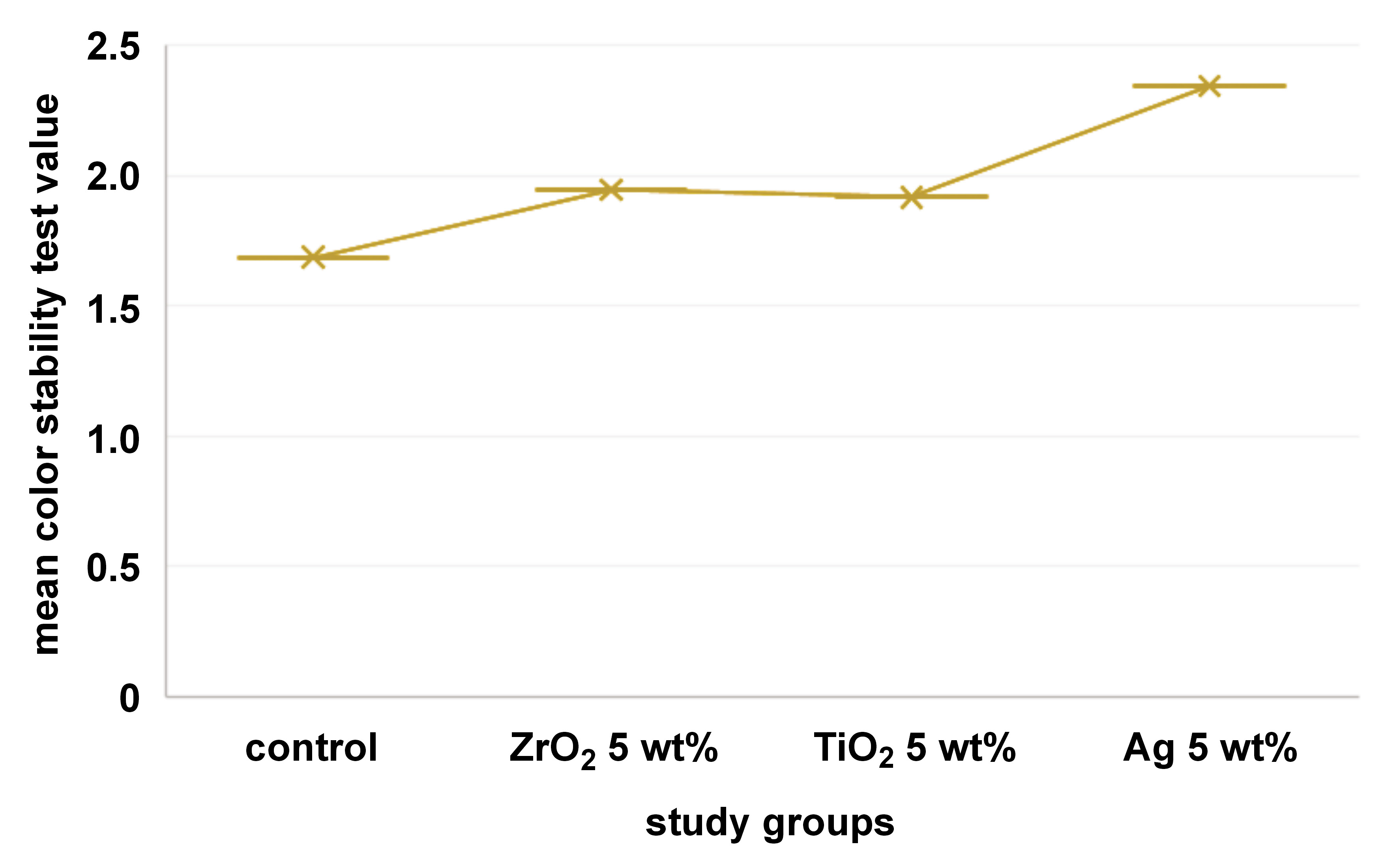 According to the descriptive data regarding color stability, the PMMA specimens without the addition of NPs had a lower mean value of color change (1.687 ±0.144) as compared to the other 3 groups – the TiO2 NPs group (1.917 ±0.159), the ZrO2 NPs group (1.946 ±0.022) and the Ag NPs group, which showed the highest mean color change (2.344 ±0.013) (Table 5, Figure 4).