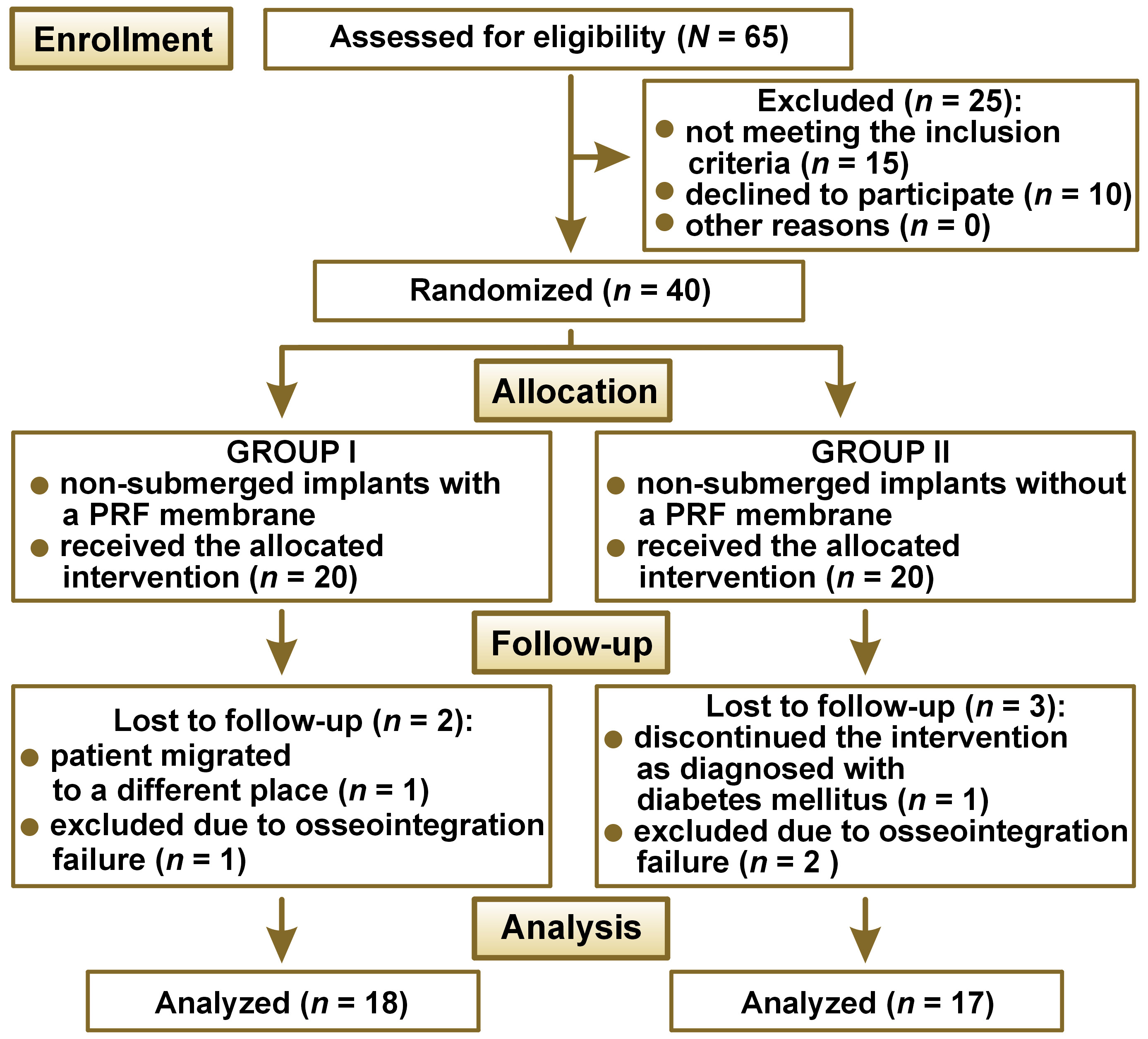 The 40 patients were randomly divided into 2 groups of 20 participants: group I received non-submerged implants (cylindrical implants with a parallel body and a core design) with a PRF membrane; and group II received non-submerged implants alone. Randomization was carried out by an independent researcher (C.A.), who was unaware of the study design, by using a computer-generated code at a 1:1 ratio. Allocation was concealed in opaque envelopes labeled with patient study numbers, which were opened before the surgical procedure. The study followed the CONSORT (Consolidated Standards of Reporting Trials) guidelines, and the CONSORT flow diagram is shown in Figure 1.