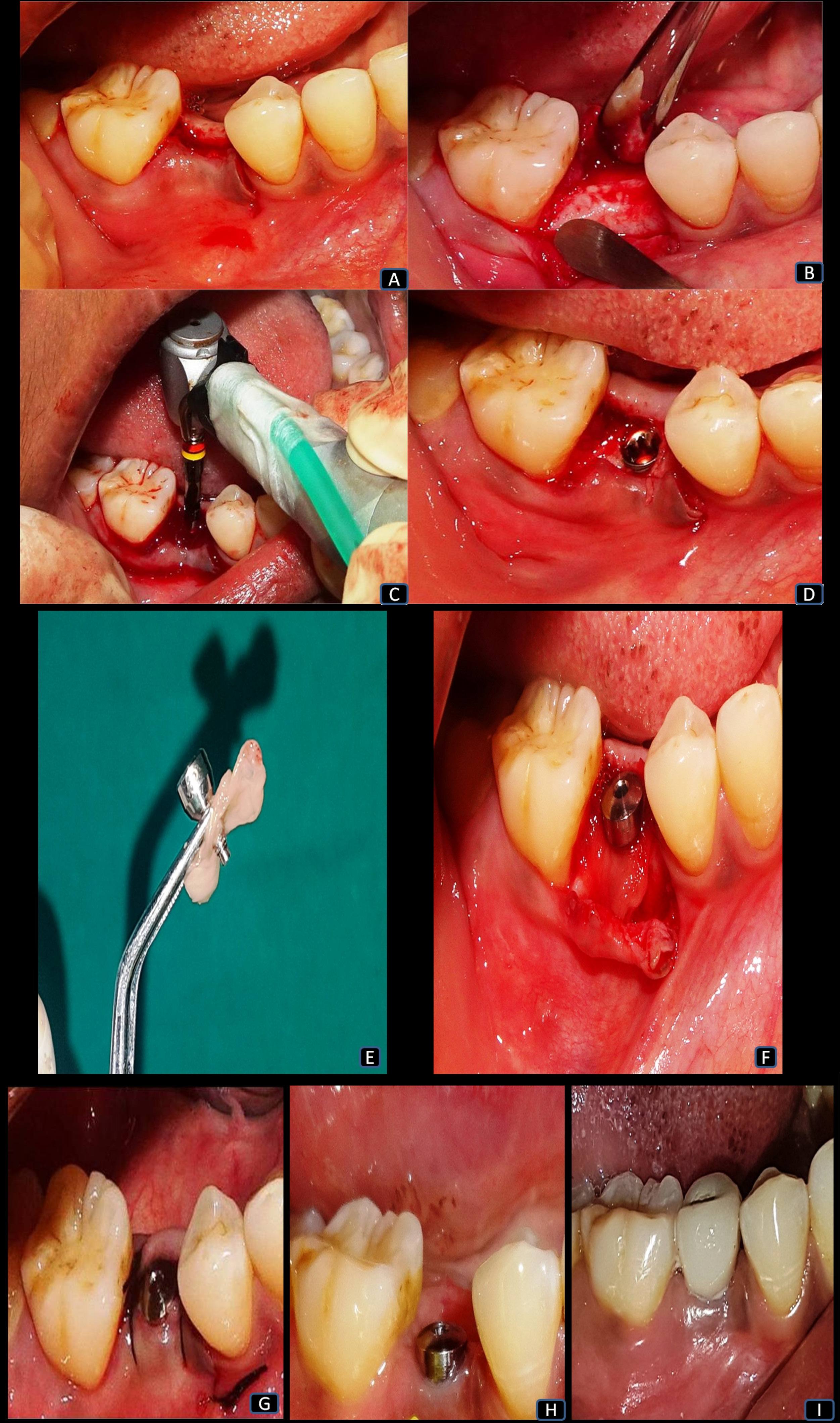 This double-blind prospective randomized controlled clinical trial was conducted between May 2018 and April 2019. Patients with partially edentulous posterior mandibular sites were selected from the outpatient clinic of the Department of Periodontology, Sibar Institute of Dental Sciences, Guntur, India. All potential participants received information about the study design, and written informed consent was obtained from those willing to participate. A total of 40 patients (23 males and 17 females) were included in the study. The institutional ethics committee approved the study (Ref. No. 111/IEC SIBAR/Lr/17), and it was registered with the Clinical Trials Registry – India (CTRI) (No. 2018/05/013713).