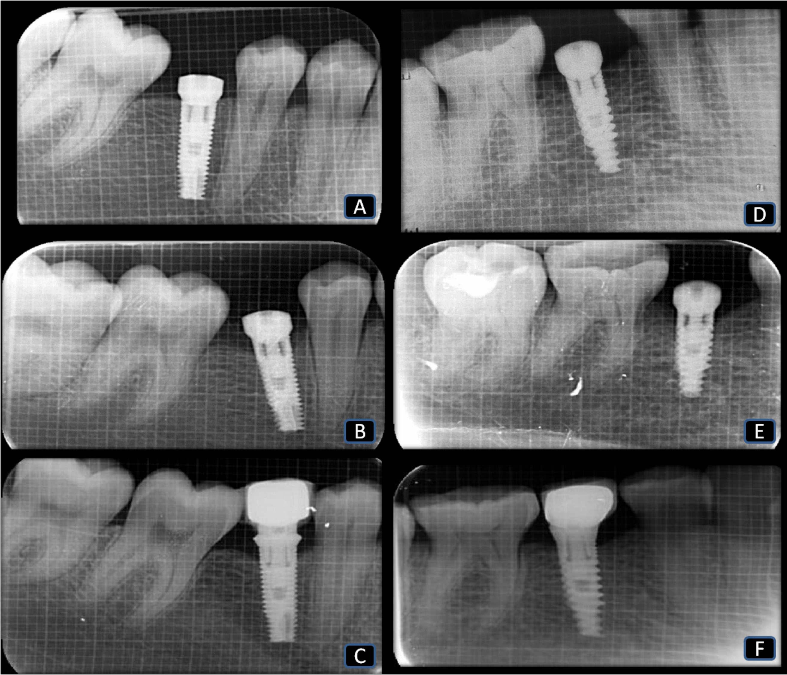 At 3 months post-op, the healing cap was replaced with a prosthetic abutment (Figure 2). The restoration was provided with a cement-retained porcelain-fused-to-metal ceramic crown (Figure 2). All outcome measures were evaluated immediately post-op (baseline), and at 3 months and 6 months post-op for both groups. Figure 3 shows the digital IOPA radiographs for both groups.