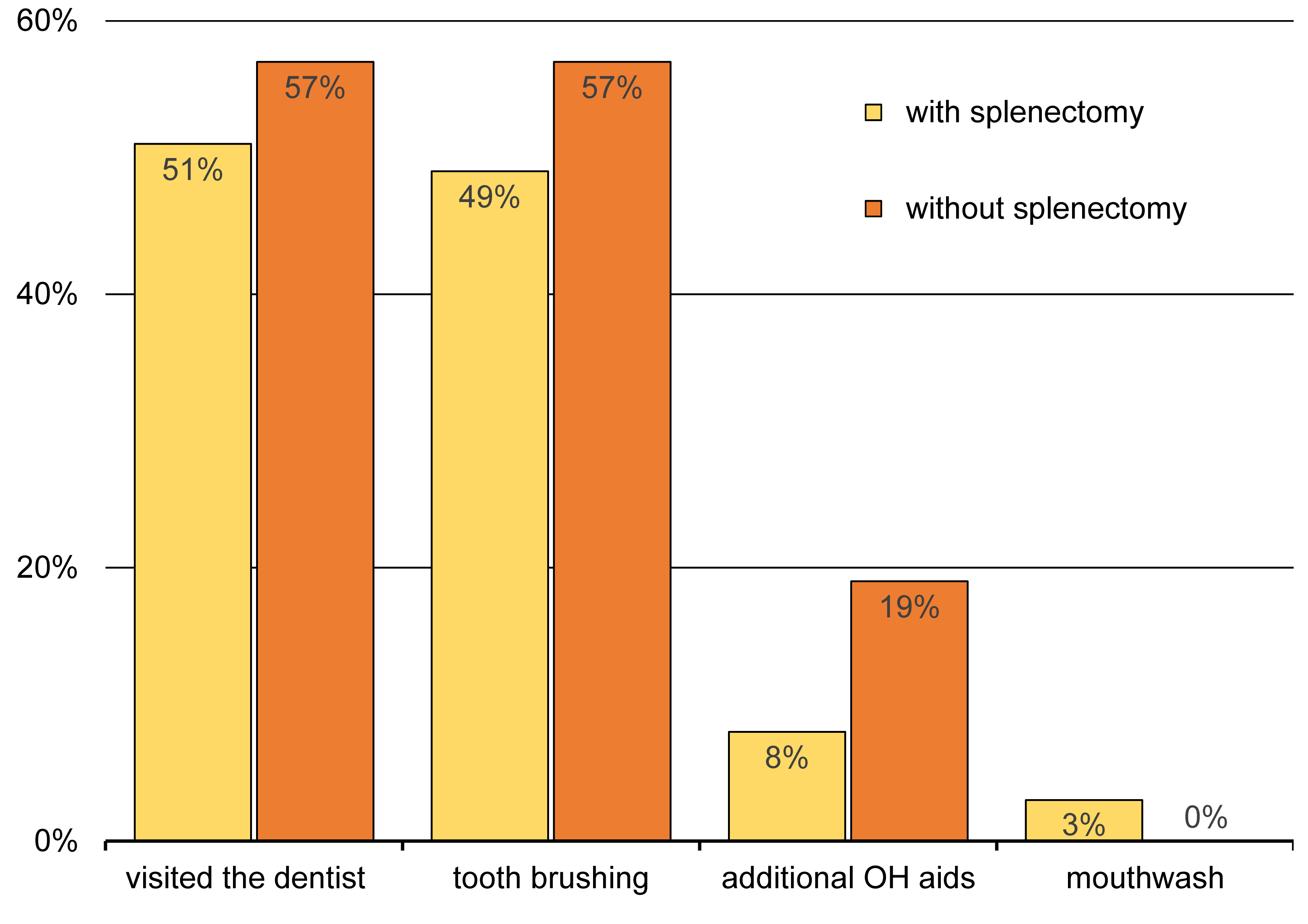 Results. Of individuals with and without splenectomy, tooth brushing was reported in 49% and 57%, respectively (p > 0.05). Individuals with splenectomy had lower plaque and gingival bleeding scores (p ≤ 0.05). Salivary secretion was identical in both groups. Caries experience and the caries risk were higher in individuals without splenectomy (p > 0.05 and p ≤ 0.05, respectively).