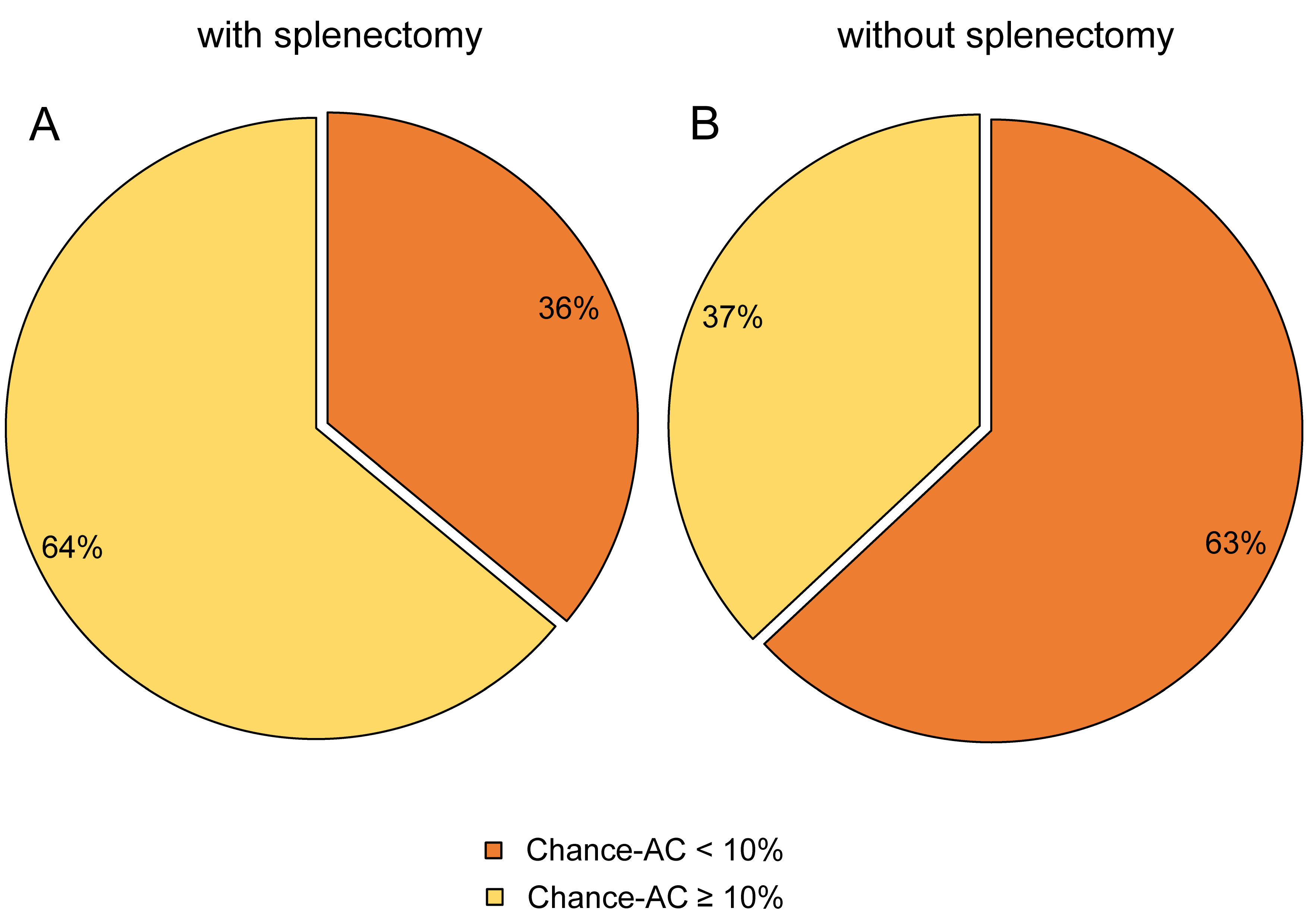 Both individuals with and without splenectomy demonstrated ‘very high’ caries risk profiles, as illustrated by the Cariogram, with a low Chance-AC of 17 ±12% and 14 ±14%, respectively (p ≤ 0.05) (Table 1). Seventy-six percent of the total sample had Chance-AC ≤ 20%, while 45% had Chance-AC < 10% (data not shown). Figure 2 presents the distribution of individuals from both groups according to Chance-AC <10% and ≥10%, with more individuals from the group who had not undergone splenectomy falling into the higher risk category (p ≤ 0.05).