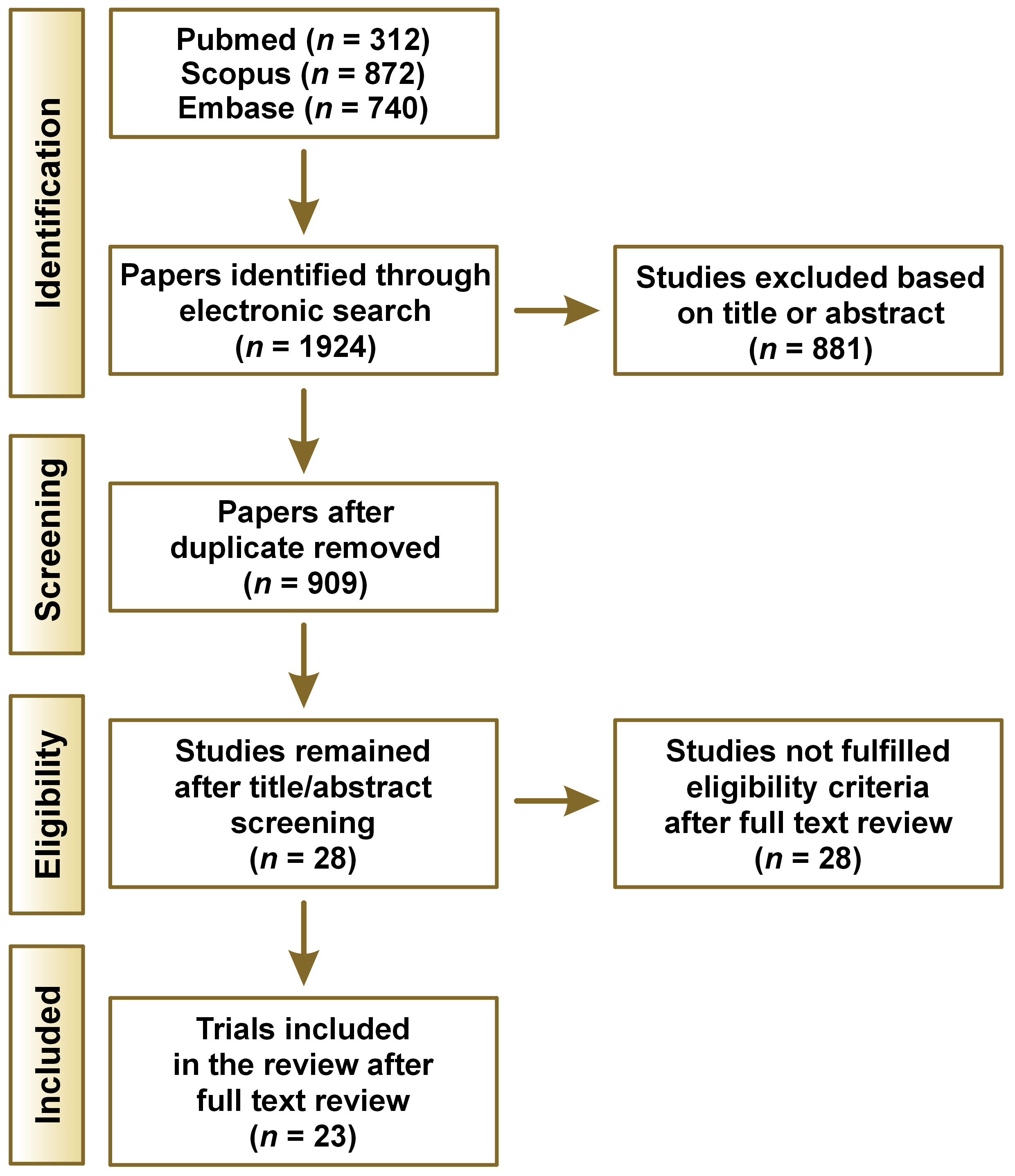 A total of 1924 papers were identified through the electronic search. After duplicate papers were removed by EndNote X9, 909 papers remained. Afterwards, two investigators independently evaluated the titles and abstracts considering the inclusion and exclusion criteria. Inconsistencies between reviewers were excluded from the study unless a consensus was reached. Full texts of 28 relevant papers were selected and reviewed thoroughly, and 23 articles met the final criteria for entering this review (Figure 1). We extracted the following data from the included studies to facilitate comparison among the articles: number of participants, type of intervention, follow-up time, diagnostic method used, and conclusions.