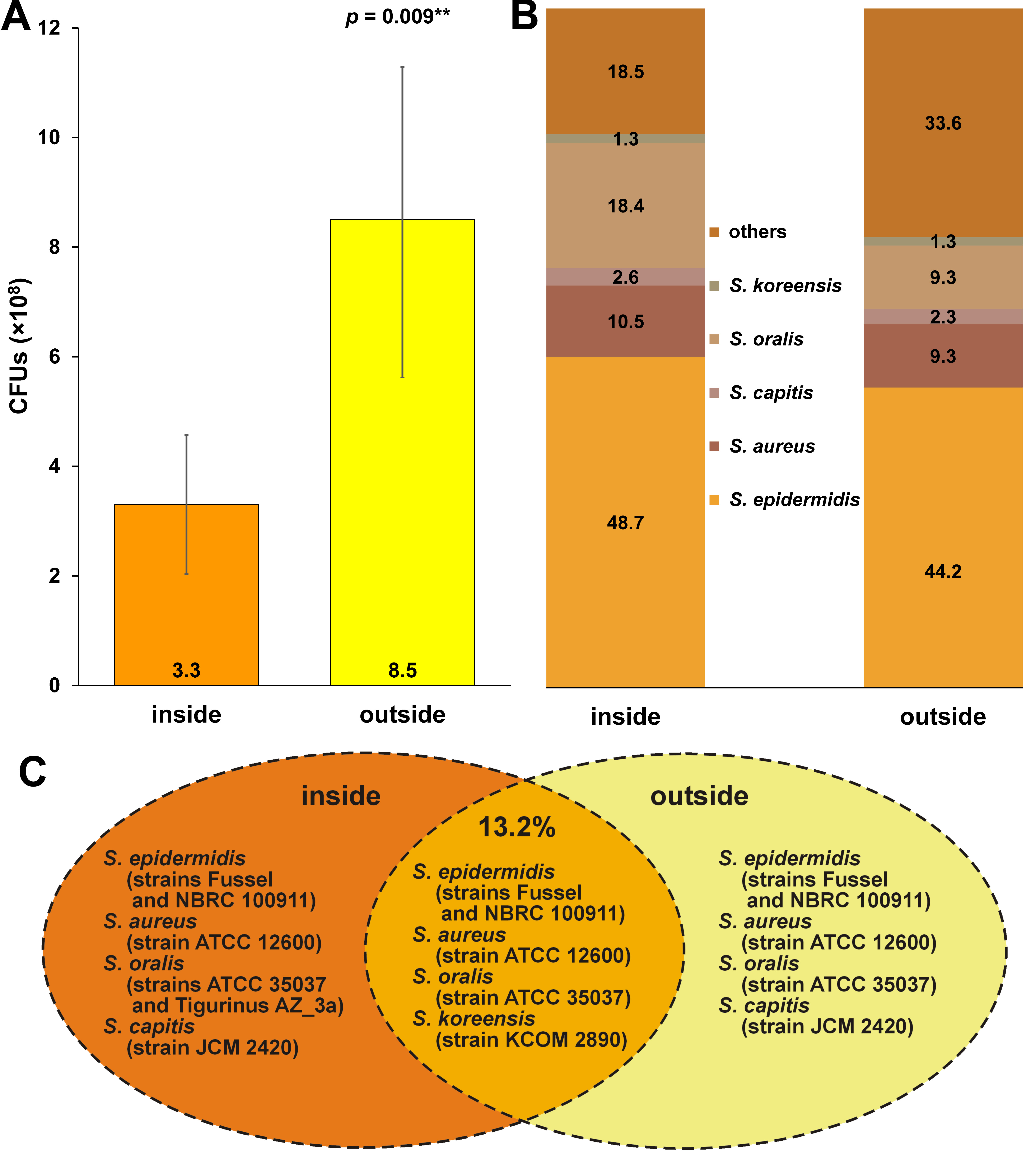 The average CFU count on the inner and outer layers of the masks was 3.3 × 108 and 8.5 × 108, respectively, and the difference was statistically significant (p = 0.009) (Figure 1). On both sides of the masks, the following bacterial species were found: Staphylococcus epidermidis (S. epidermidis) (inside: 48.7%; outside: 44.2%); Staphylococcus aureus (S. aureus) (inside: 10.5%; outside: 9.3%); Staphylococcus capitis (S. capitis) (inside: 2.6%; outside: 2.3%); Streptococcus oralis (S. oralis) (inside: 18.4%; outside: 9.3%); and Streptococcus koreensis (S. koreensis) (inside: 1.3%; outside: 1.3%) (Figure 1). Furthermore, Streptococcus salivarius (S. salivarius) (7.9%), Staphylococcus lugdunensis (S. lugdunensis) (2.8%), Streptococcus infantis (S. infantis) (1.3%), Streptococcus rubneri (S. rubneri) (1.3%), Streptococcus australis (S. australis) (1.3%), Streptococcus sanguinis (S. sanguinis) (1.3%), Streptococcus parasanguinis (S. parasanguinis) (1.3%), and Moraxella osloensis (M. osloensis) (1.3%) were found on the inner layer of the masks only (Figure 1, ‘others’ in the inside group). In contrast, Staphylococcus warneri (S. warneri) (18.6%), Staphylococcus caprae (S. caprae) (2.5%), Streptococcus mitis (S. mitis) (2.5%), Enterococcus faecium (E. faecium) (2.5%), Psychrobacillus lasiicapitis (P. lasiicapitis) (2.5%), Bacillus thioparans (B. thioparans) (2.5%), and Lactobacillus plantarum (L. plantarum) (2.5%) were found on the outer layer of the masks only (Figure 1, ‘others’ in the outside group). On the inner and outer layers, 13.2% of the bacteria found were of the same strains (S. epidermidis: strains Fussel and NBRC (National Institute of Technology and Evaluation (NITE) Biological Resource Center) 100911; S. aureus: strain ATCC (American Type Culture Collection) 12600; S. oralis: strain ATCC 35037; and S. koreensis: strain KCOM (Korean Collection for Oral Microbiology) 28901), while for the rest of the bacteria (S. epidermis, S. aureus, S. oralis, and S. capitis), the strains were different, even though the species were the same (Figure 1).