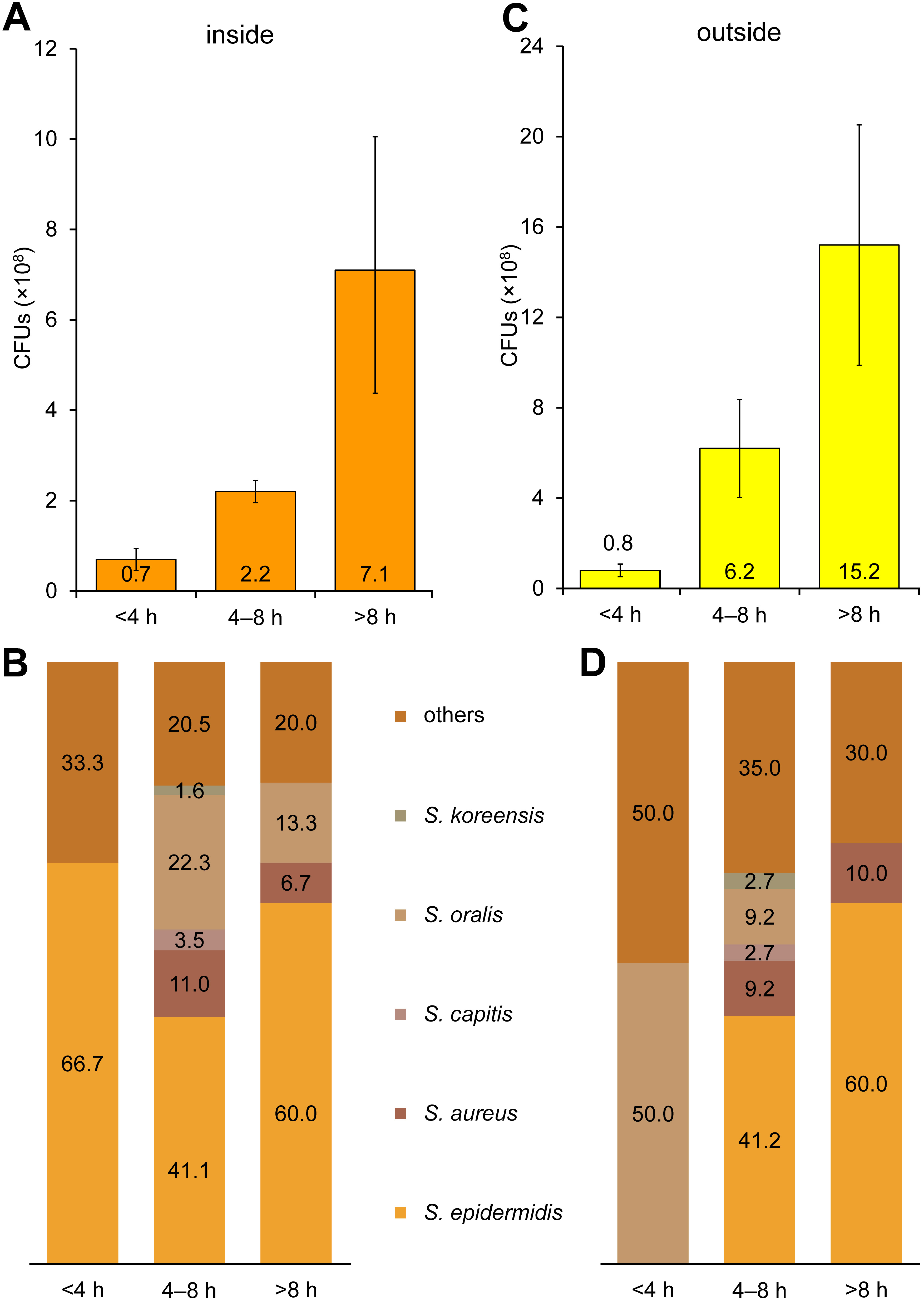 The contamination rates on the inner layer increased as the mask-wearing time increased (<4 h: 0.7 × 108 CFUs; 4–8 h: 2.2 × 108 CFUs; and >8 h: 7.1 × 108 CFUs) (Figure 2). When the mask-wearing time was less than 4 h, most bacteria found were S. epidermidis (66.7%). Staphylococcus epidermidis (41.1%), Streptococcus aureus (11.0%), S. capitis (3.5%), S. oralis (22.3%), and S. koreensis (1.6%) were discovered on the masks worn for 4–8 h. In addition, S. epidermidis (60.0%), S. aureus (6.7%) and S. oralis (13.3%) were found on the inner layer of the masks worn for more than 8 h; however, S. capitis and S. koreensis were not detected (Figure 2).