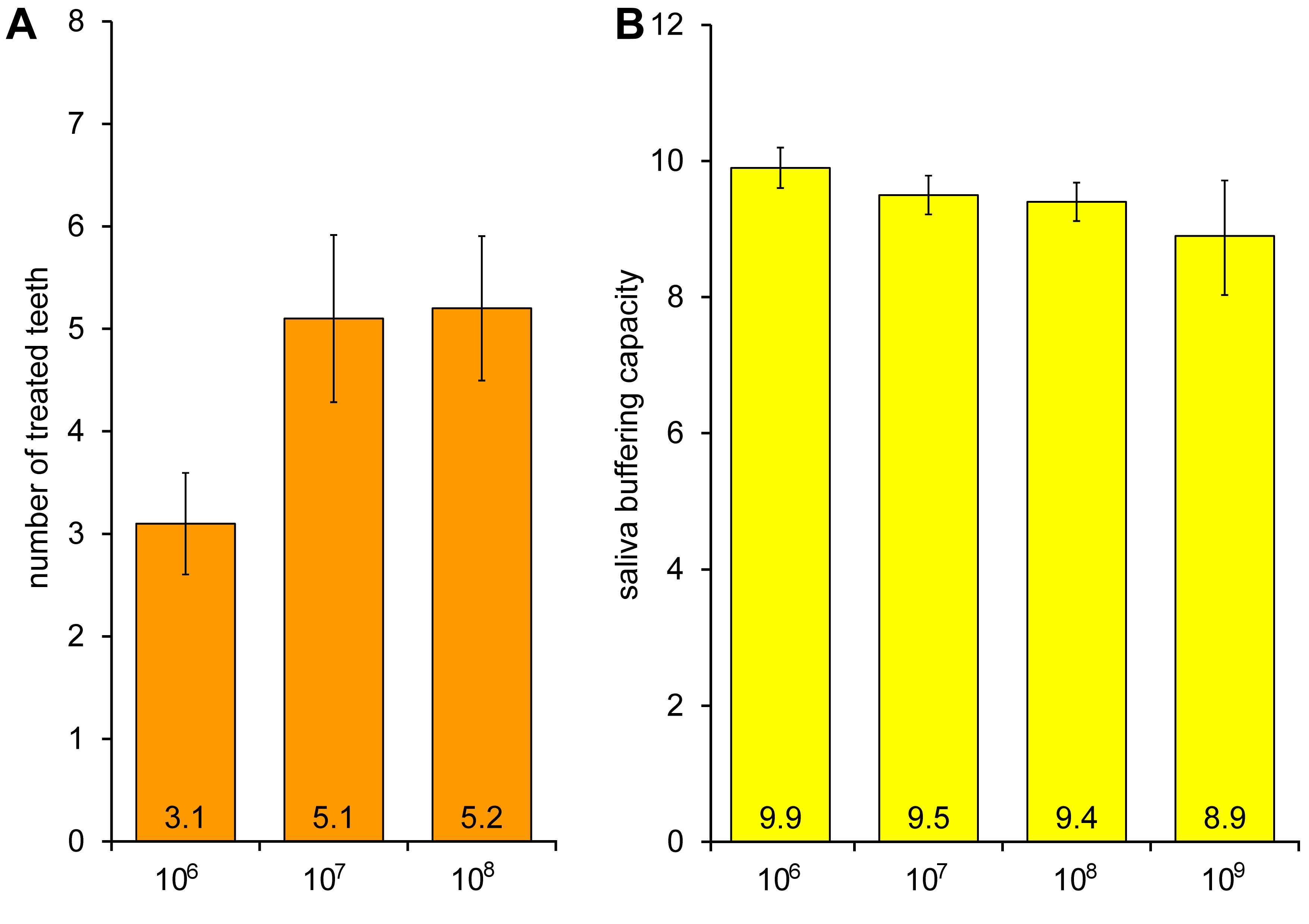 All factors were graphically analyzed. The inner layer contamination rate increased (from 3.1 × 106 to 5.2 × 108 CFUs) as the number of treated teeth increased, but the differences were not statistically significant (Figure 3). In addition, as the saliva buffering capacity decreased (from 9.9 to 8.9), the contamination rate on the inner layer of the masks increased. These differences were not statistically significant, either (Figure 3).