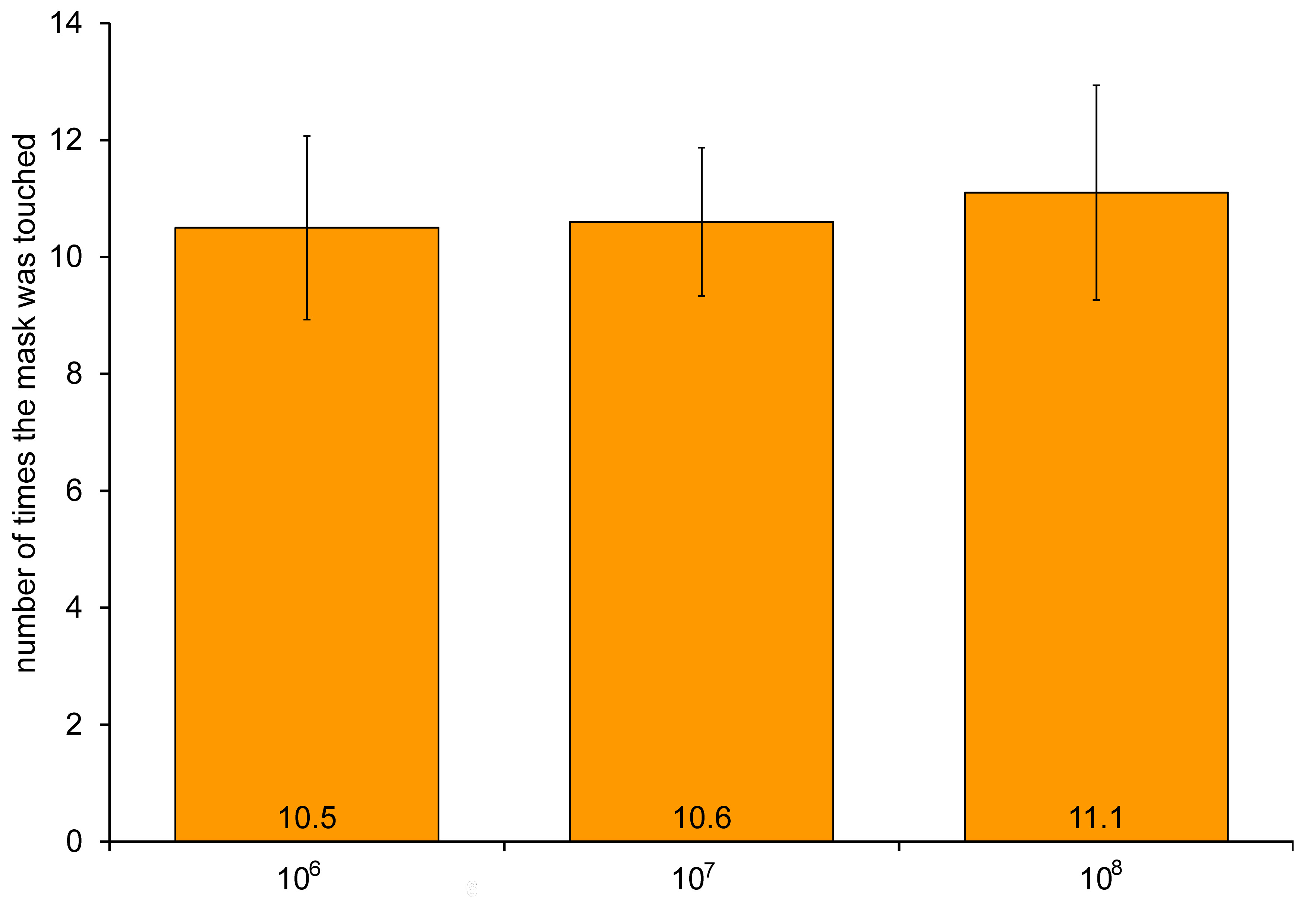 We hypothesized that there could be a correlation between the number of times the mask was touched and mask contamination on the outer layer; hence, behavioral factors were analyzed. The participants touched the mask approx. 10.7 ±9.9 times, and the outer layer contamination rate increased (from 10.5 × 106 to 11.1 × 108 CFUs) with the number of times the mask was touched. Yet, the differences were not statistically significant (Figure 4).