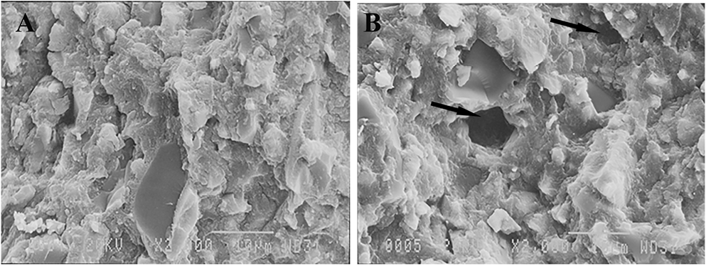 Scanning electron microscopy photomicrograph demonstrated several pits due to filler particle exfoliation on the surfaces of the RBCs after aging. The number of pit defects and the deterioration of the resin network were large enough to affect their characteristics, and these changes were more pronounced in the bulk-fill RBC (Figure 2).