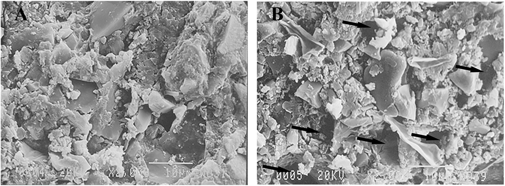 Scanning electron microscopy images of the 2 types of resin composites are shown in Figure 1 and Figure 2. Irregularly shaped filler particles were found in both resin composites. In the bulk-fill type, clusters of fillers with approximate nano dimensions can be seen. The mechanical properties of the composite resins deteriorate during the aging process, as evidenced by surface changes, resin–matrix degradation and filler debonding, all of which can be seen in the SEM images. As the composite resin aged, several pits appeared as a result of exfoliation of filler particles. These findings may explain the reported behavioral variations before and after the aging process.