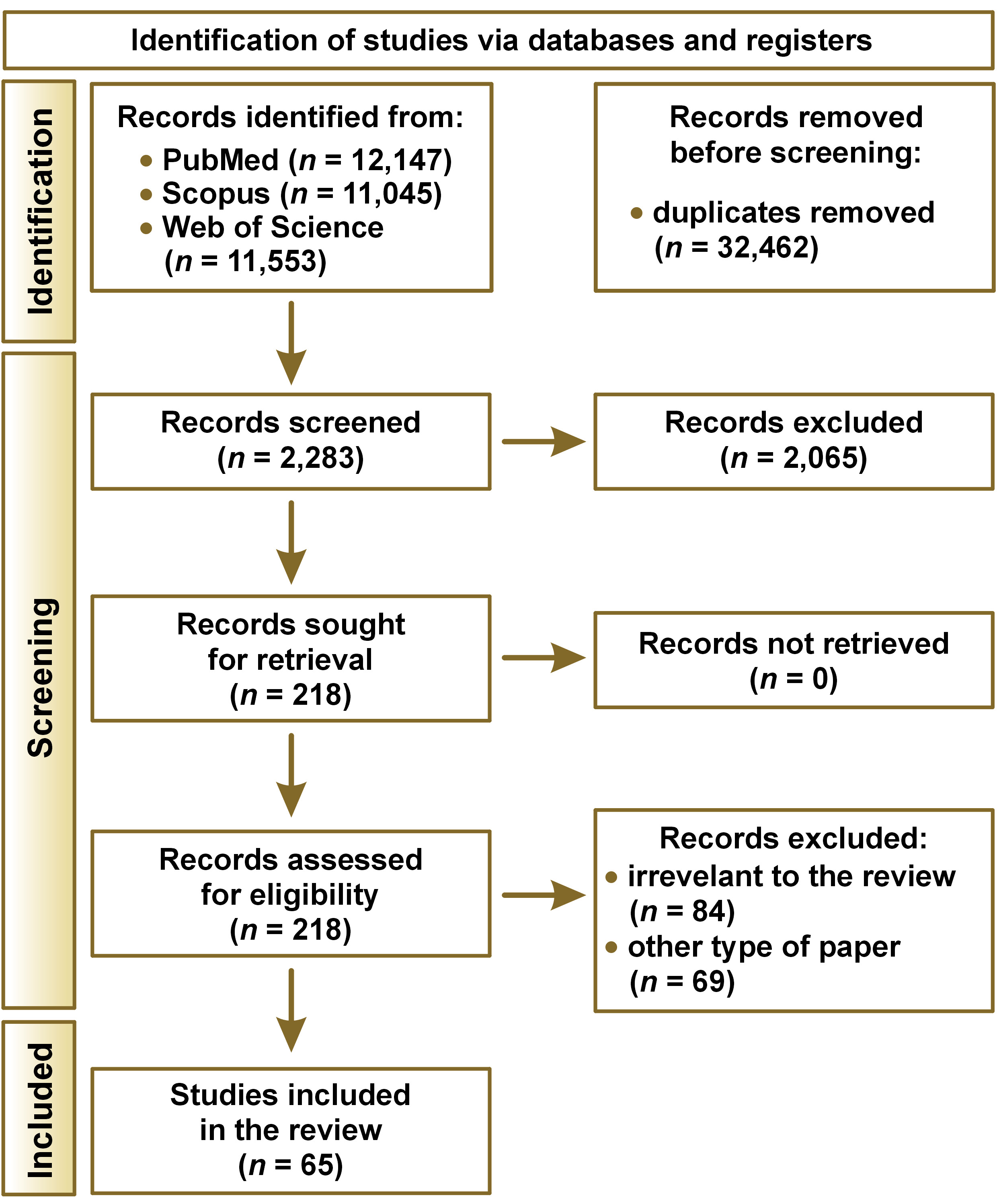 The literature search revealed 34,745 works from the PubMed/MEDLINE, Scopus and Web of Science databases, of which 32,462 were removed due to duplication. A total of 2,283 abstracts were read, with 218 meeting the inclusion criteria. Among the qualified articles, 153 either were irrelevant to the subject of our review or presented other type of paper than required, leaving 65 papers included. A PRISMA flow diagram presenting the search strategy is shown in Figure 1.