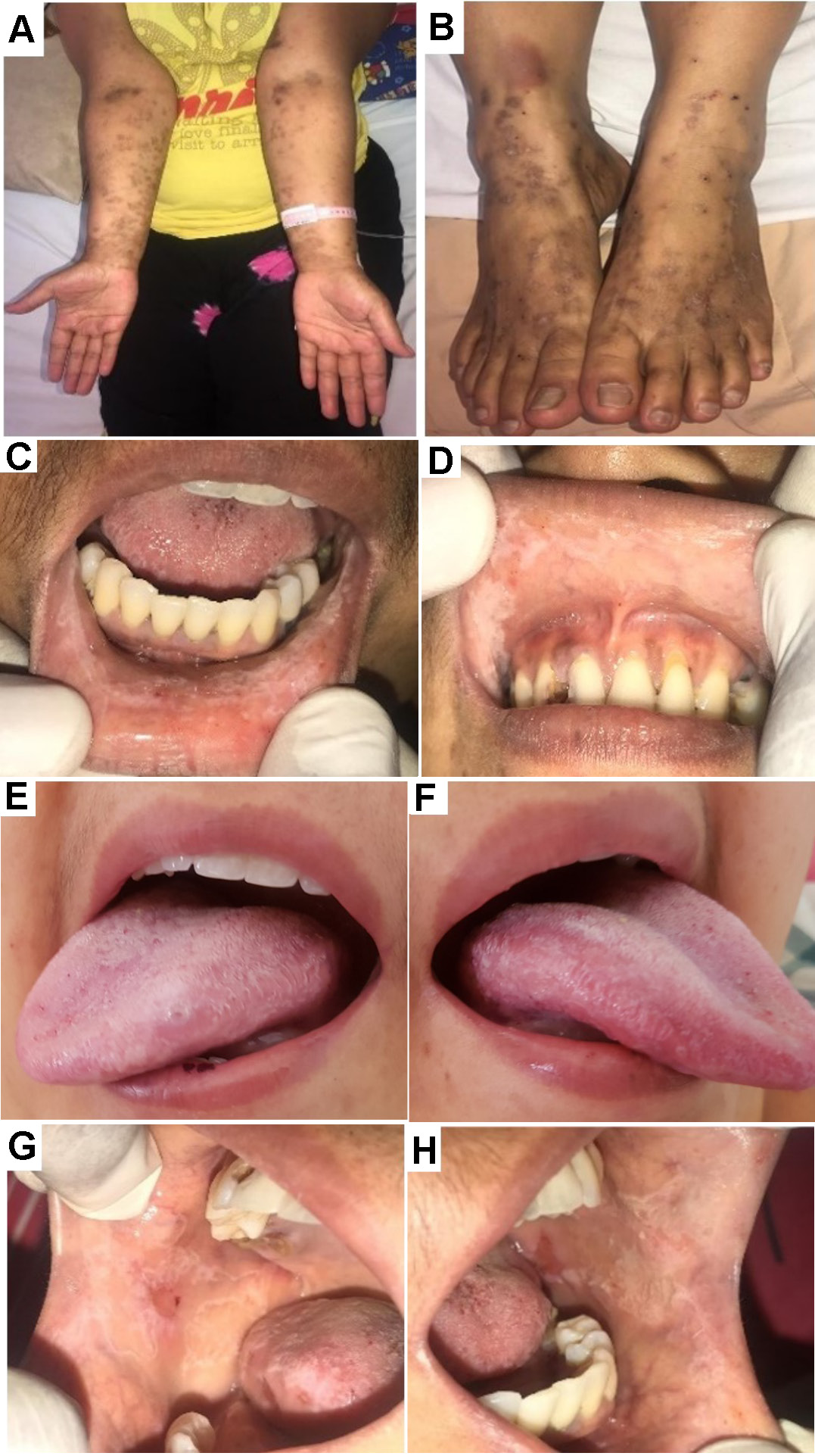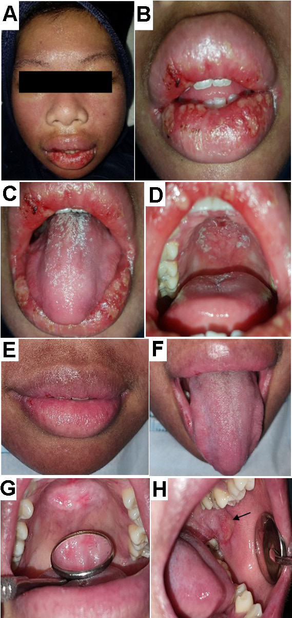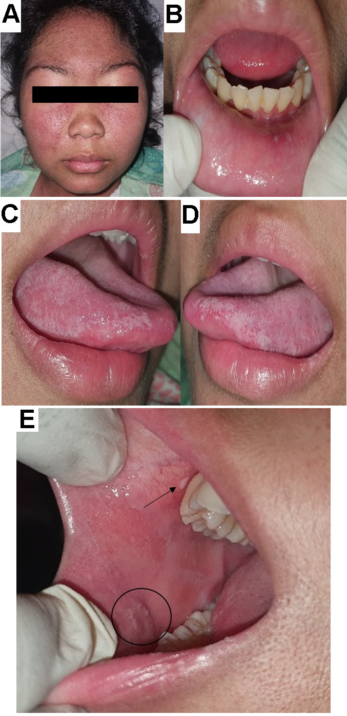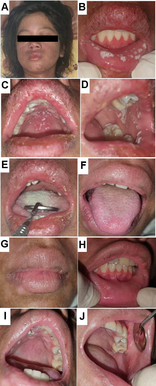 This article is a case series study with a prospective design conducted in a single center using consecutive sampling. The patients were admitted to Dr. Hasan Sadikin Central General Hospital (Bandung, Indonesia), a government-run academic and community hospital. An Internal Medicine and Pediatrics resident, supervised by their consultant, performed the examinations of systemic conditions and laboratory assessments needed to support the diagnosis. At the same time, an Oral Medicine resident conducted intraoral examinations under the supervision of their consultant. The final diagnosis was based on patient complaints, clinical (extraoral and intraoral) observations and laboratory findings. The clinicians provided medication for systemic diseases, whereas intraoral lesions were treated by oral medicine specialists. Patient improvement was followed up for 3–4 weeks and any changes in medication type or dosage were reported. The results of the examinations, diagnosis, treatment, and oral lesion progress were documented in the patient’s medical records. The patients provided consent to document the intraoral lesions for further evaluation.