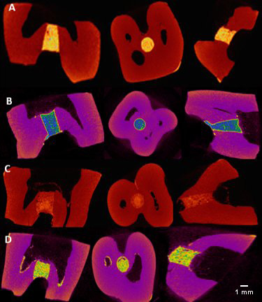 Cavit G and cotton pellets were removed from the cavities after the hardening reaction. The samples were removed from the cylinder and the silicone material on their surfaces was cleaned in preparation for micro-CT scanning.