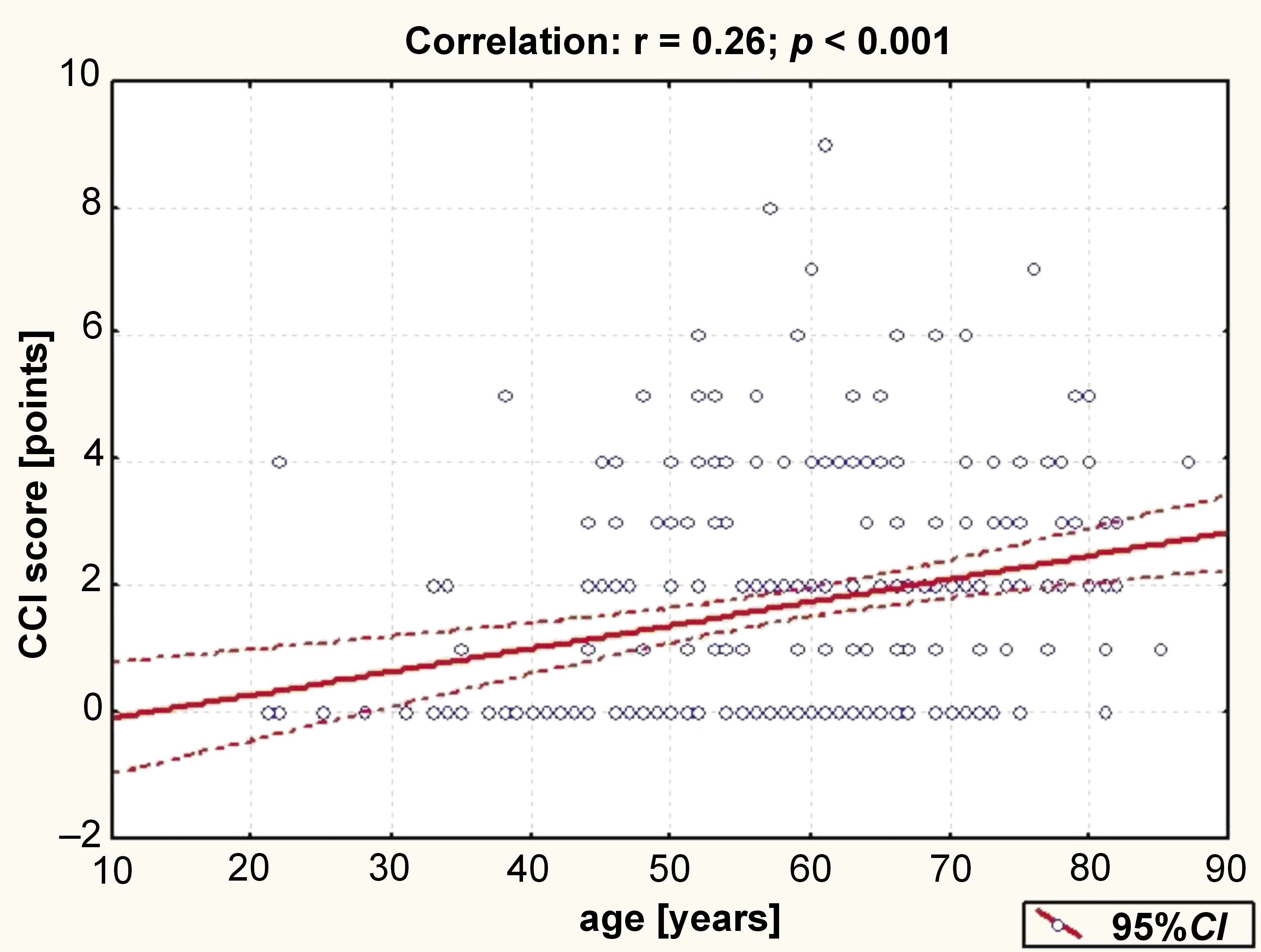 A weak direct correlation was found between the patients’ CCI score and age (Figure 1).