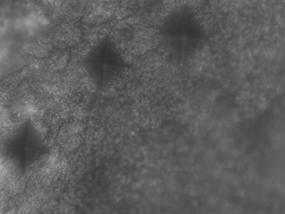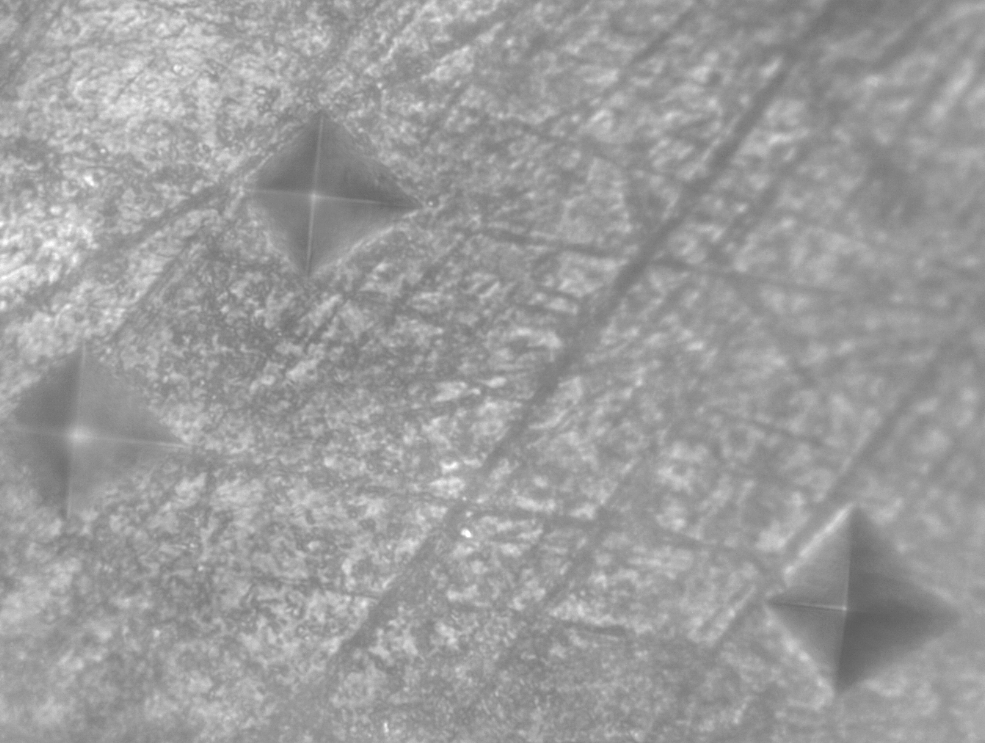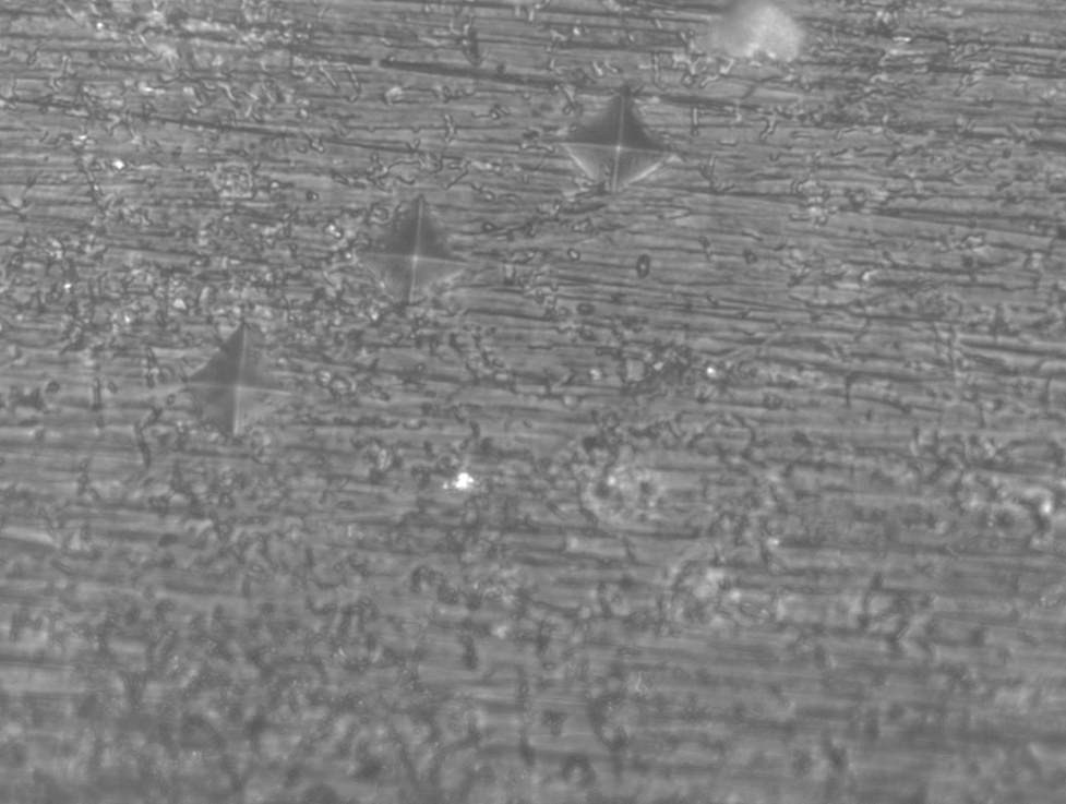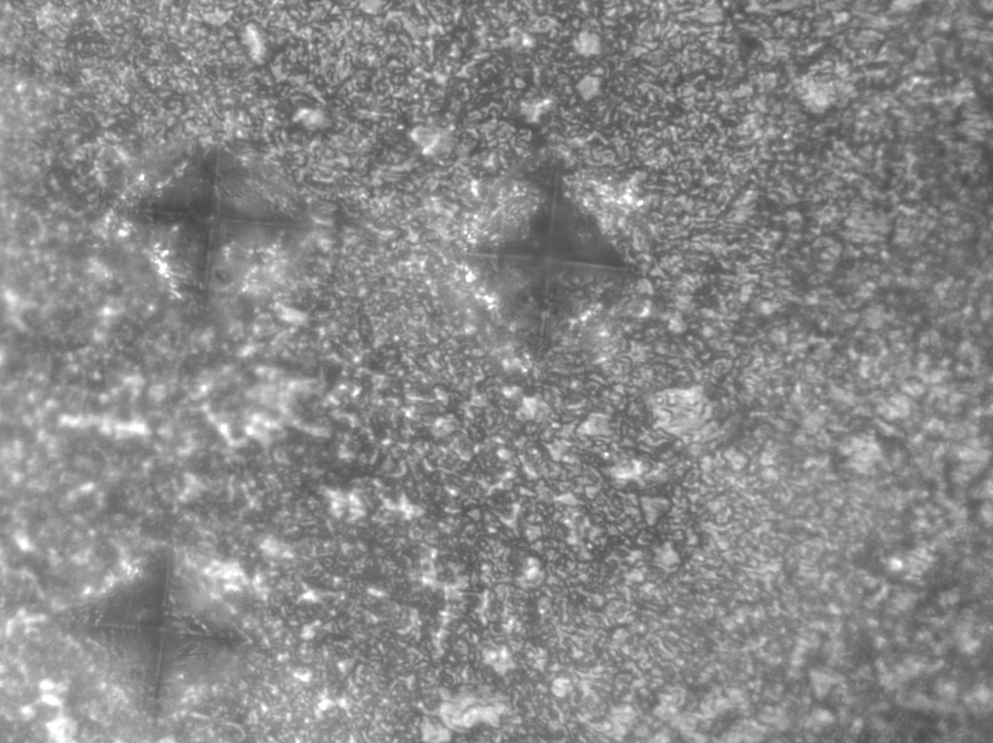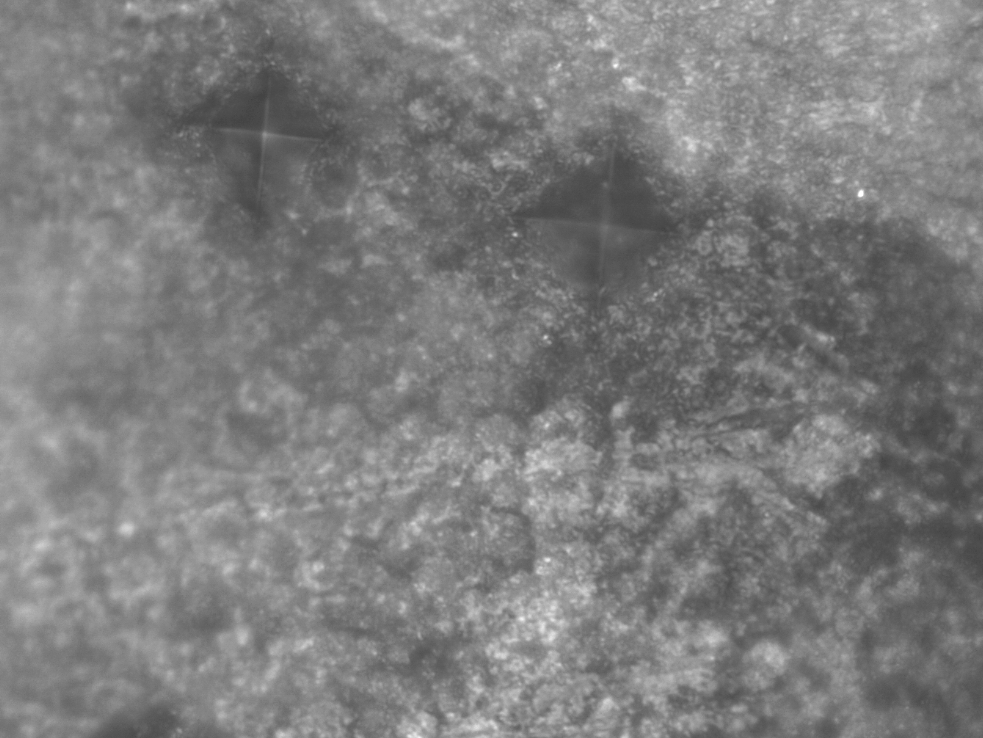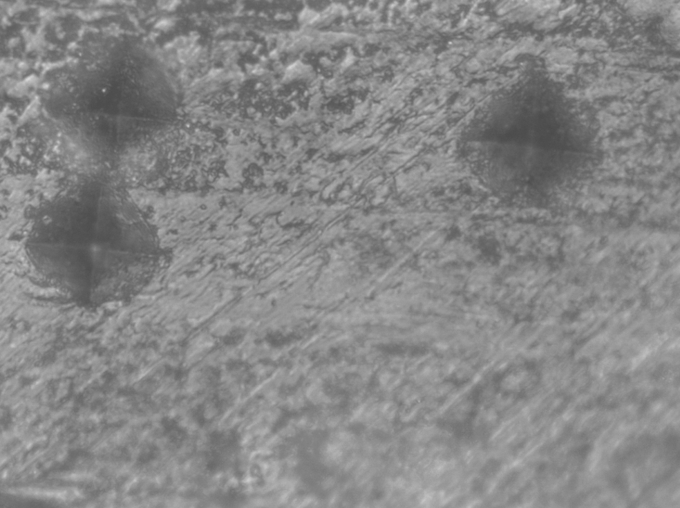 The study found significant differences in the surface microhardness between the 3 time intervals in the control group (p < 0.0001), as confirmed by ANOVA. The results of Tukey’s test demonstrated significant differences in the surface microhardness before demineralization, after demineralization and after treatment. However, there was no significant difference in the surface microhardness between 2 intervals, after demineralization and after treatment in the control group (p = 0.12). Figure 3 presents the Vickers image of a sample from the control group after the application of the study cycles.