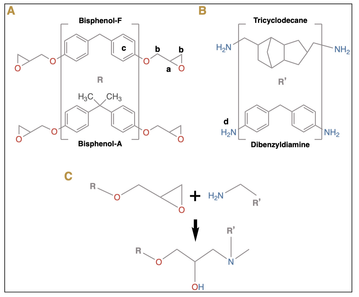 With regard to Table 1, it must be emphasized that all of the listed ERBSs shall finally form an epoxy resin; however, one should take into consideration that the structure of a material results in the formation of its properties, and the latter determines the behavior of the material. In this regard, most commercially available epoxy resins are based on diglycidyl ethers of bisphenol-A, bisphenol-F, or other phenolic compounds,25 which react with curing agents. However, almost none of the ERBSs have the same formulation; thus, in the next paragraphs of this section, we will discuss some relevant compounds in the formulations described in Table 1, alongside various other compounds in subsequent sections.