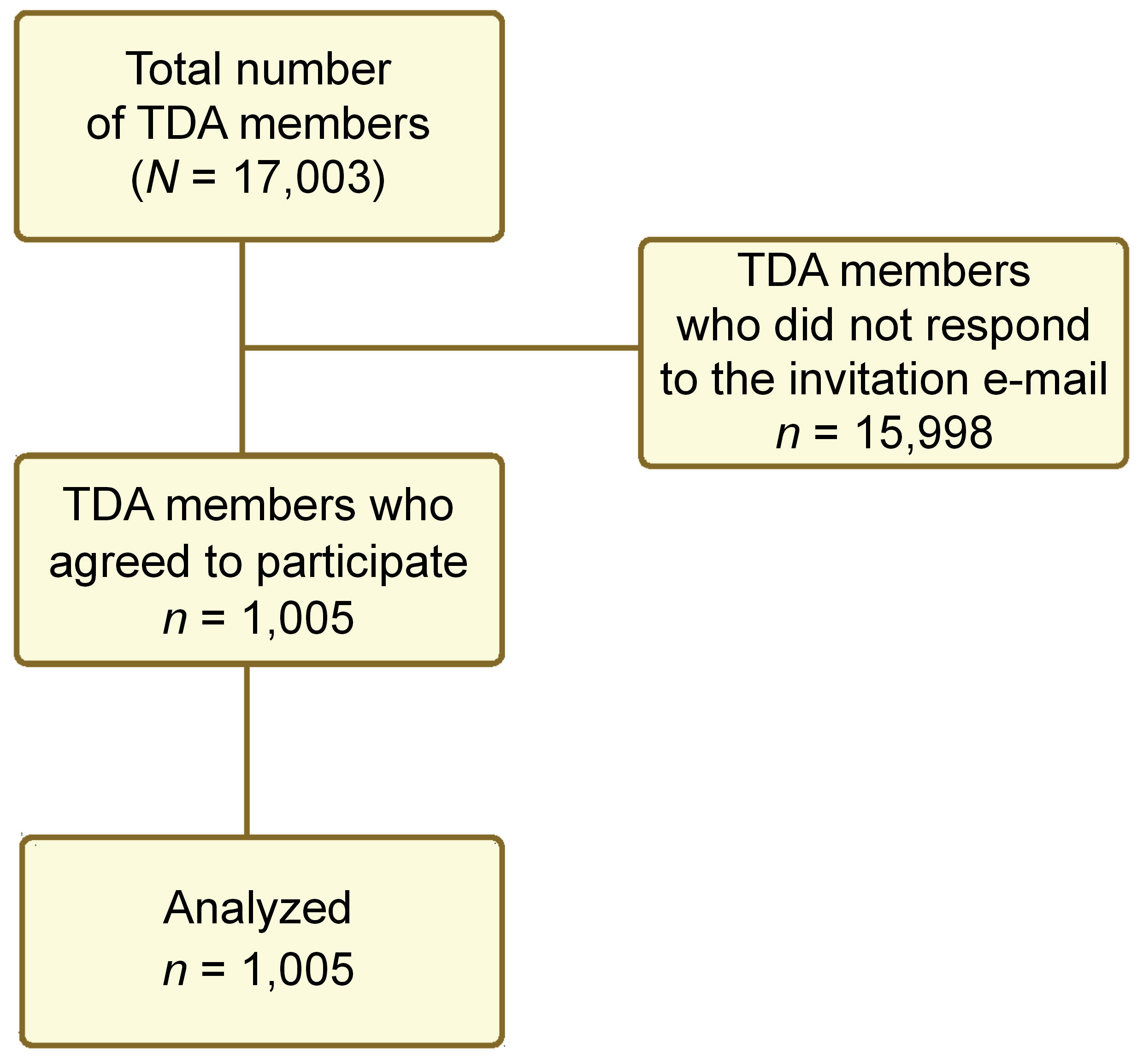 Out of the total number of 17,003, 1,005 (5.9%) dentists accepted our invitation to participate (Figure 1). The survey data was entered into a statistical software package (IBM SPSS Statistics for Windows, v. 24.0; IBM Corp., Armonk, USA).12 The answer ratios were determined, and statistical analyses were performed. All associations for the variables of gender, age, years in dental practice, and the professional status were analyzed using the χ2 test. The statistical significance level was set at p < 0.05.