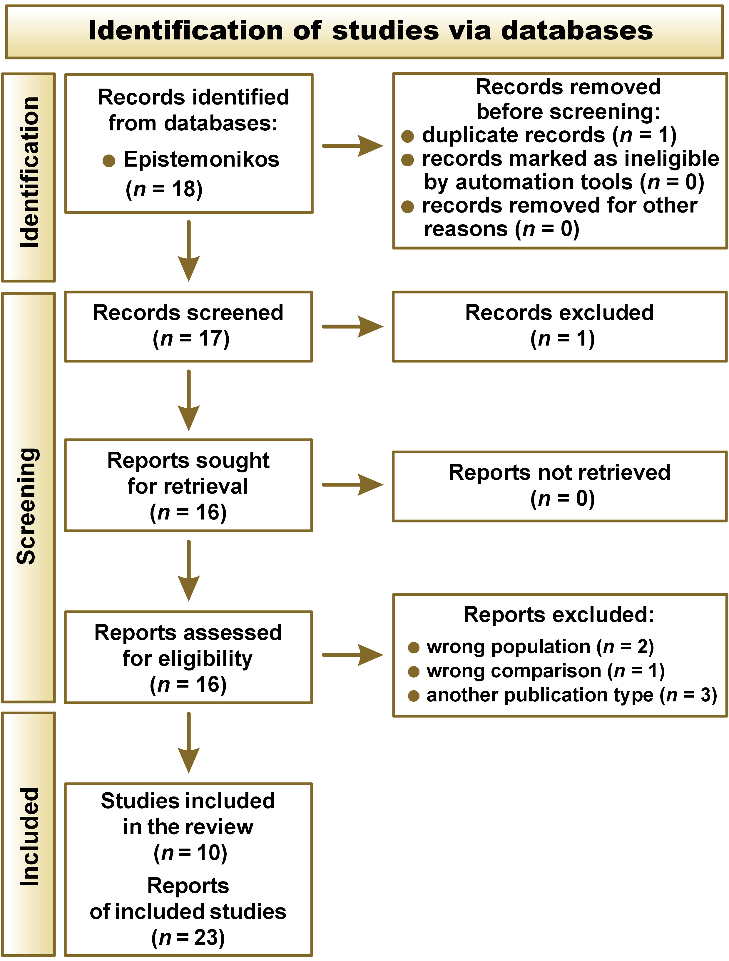 The systematic search yielded a total of 18 articles, of which 1 was a duplicate. The remaining 17 articles were screened based on their titles and abstracts, and 16 studies were included for full-text screening. Ten systematic reviews6, 11, 15, 16, 17, 18, 19, 20, 21, 22 were ultimately included in the development of this FRISBEE overview, which included 23 primary studies.10, 23, 24, 25, 26, 27, 28, 29, 30, 31, 32, 33, 34, 35, 36, 37, 38, 39, 40, 41, 42, 43, 44 All primary studies were randomized clinical trials, reported in 27 references (Figure 1).10, 23, 24, 25, 26, 27, 28, 29, 30, 31, 32, 33, 34, 35, 36, 37, 38, 39, 40, 41, 42, 43, 44, 45, 46, 47, 48