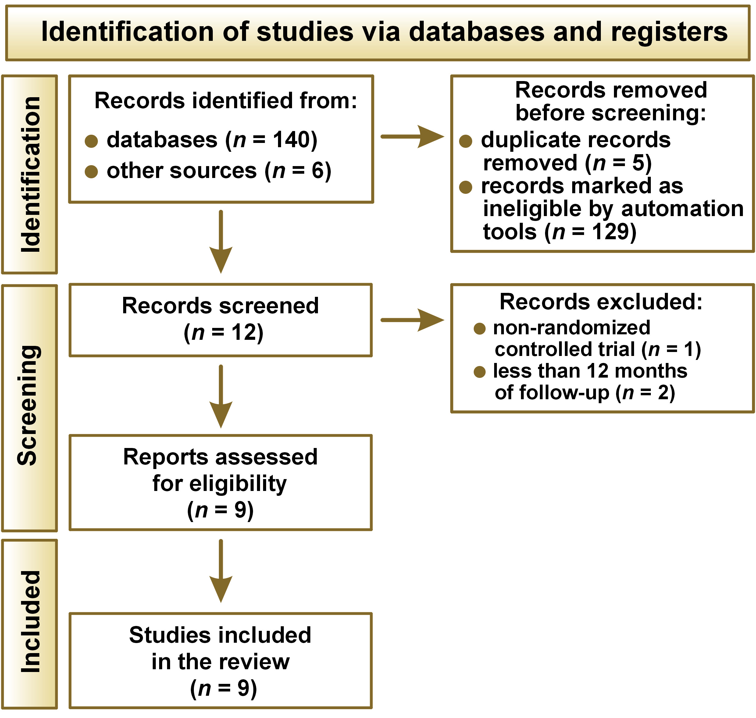 After thoroughly searching the electronic databases and other sources, 146 articles were identified. Of these, 129 articles were excluded after reading the title, as the records were irrelevant. After removing duplicates, 12 articles were screened, and 3 articles were further excluded, as one of them was not a randomized controlled trial, and the other 2 had a follow-up period shorter than 12 months.22, 26, 27 Nine articles were considered potentially eligible for this review.7, 10, 17, 28, 29, 30, 31, 32, 33 The Preferred Reporting Items for Systematic reviews and Meta-Analyses (PRISMA) flowchart is shown in Fig. 1.