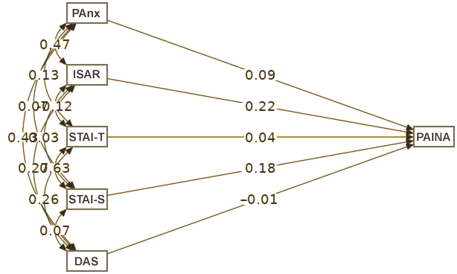 To better understand the implications of anxiety on postoperative pain, a path analysis model was created considering the set of 5 anxiety measurements (DAS, STAI-S, STAI-T, ISAR, and PAnx) as exogenous variables and the mean score of all 7 pain measurements as the endogenous variable (Figure 1). The model was overidentified, and the fit indexes were as follows: χ2 test p-value = 0.1; CFI = 1; adjusted goodness-of-fit index (adj. GFI) = 1; and RMSEA = 0.00. None of the 5 anxiety variables was significantly associated with the mean pain scores. However, the most relevant measurements with greater beta coefficients were ISAR and STAI-S. The model demonstrated that anxiety, as a set of variables, may account for approx. 12% of the variability in pain around the mean value (R2 = 0.12; confidence interval (CI) = 0.012–0.290).