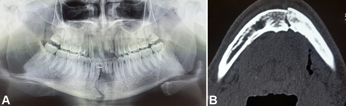 Patients with comminuted mandibular fractures, concomitant midface and dentoalveolar fractures, infected fractures, partial or complete edentulism, and systemic diseases were excluded from the study. Detailed preoperative medical and clinical examinations were conducted. The diagnosis of undisplaced or minimally displaced symphyseal or parasymphyseal fractures was based on clinical and radiographic assessments. Orthopantomograms were used to evaluate mandibular lower border displacement, with displacements of less than 5 mm included in the study (Figure 1). Advanced diagnostic techniques, including low-dose radiation and 3D assessments using computed tomography (CT), cone beam computed tomography and magnetic resonance imaging, facilitate comprehensive evaluation of head and neck disorders, including the assessment of both soft and hard tissue injuries.5, 6, 7 Therefore, CT with 3D reconstruction of the face was performed, with fractures exhibiting bucco-lingual overlap of less than 5 mm included in the study (Figure 1).