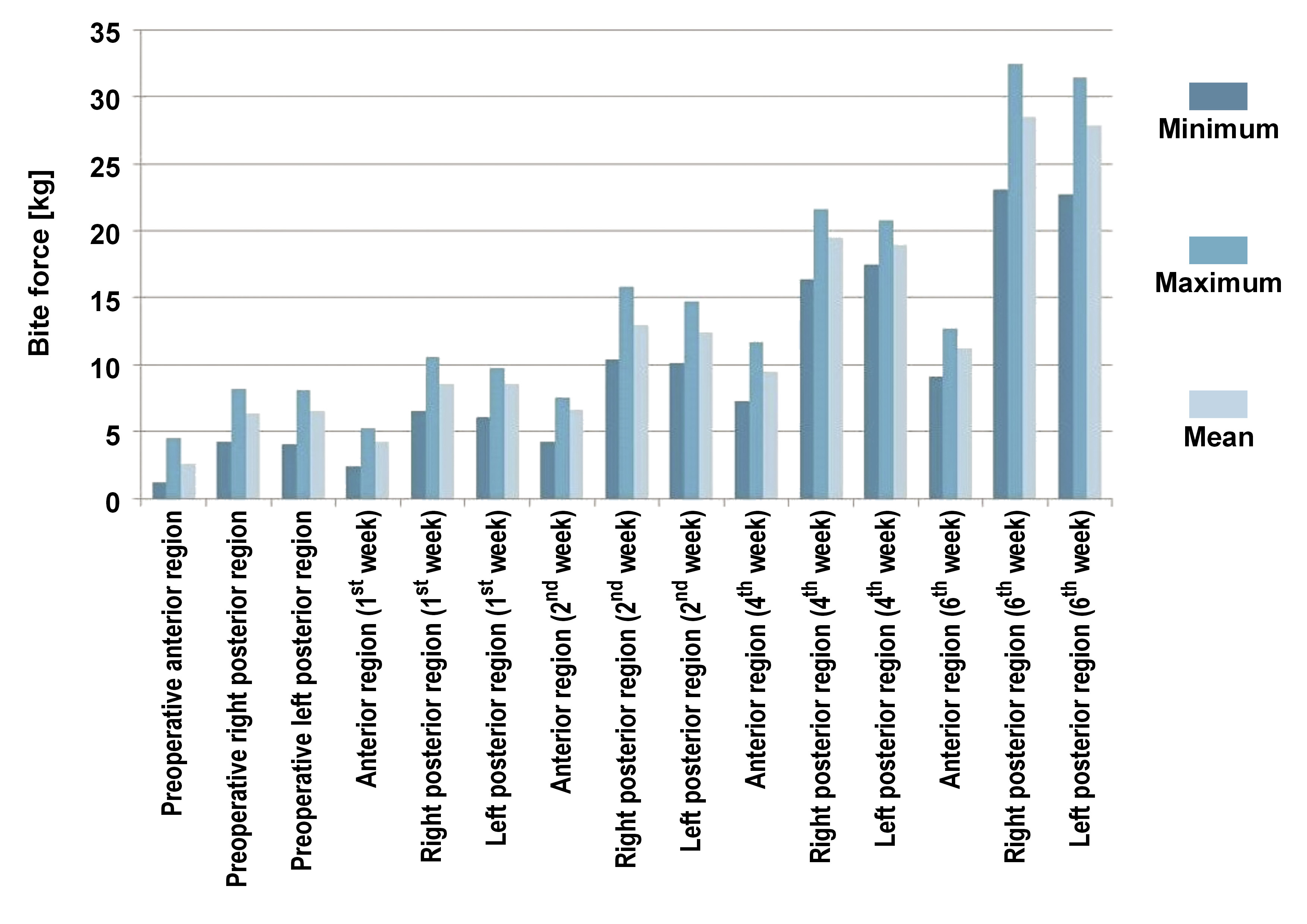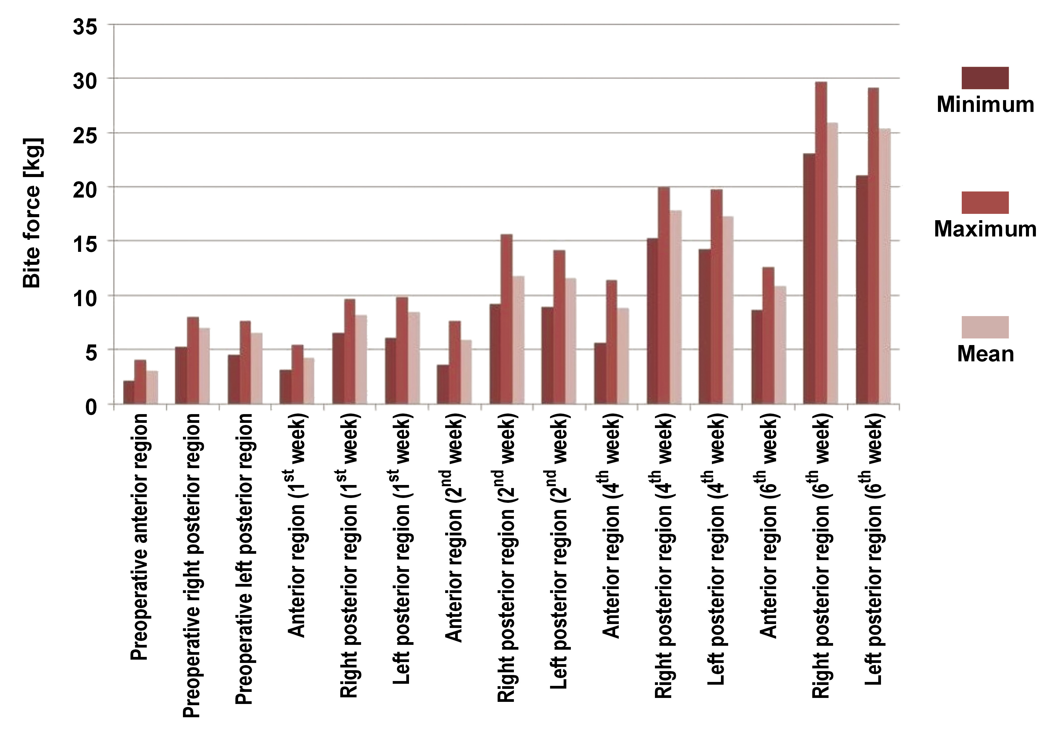 Bite force measurements were recorded using a digital bite force recorder (HARIOM Electronics, Vadodara, India). In the study groups, the bite force was measured at the incisors, right molars and left molars before surgery and at 1, 2, 4, and 6 weeks after surgery. A single bite force measurement was recorded for the control group at the incisors, right molars and left molars in a similar manner. The data was tabulated and analyzed statistically using unpaired t-tests and analysis of variance (ANOVA) with Tukey’s post hoc tests.