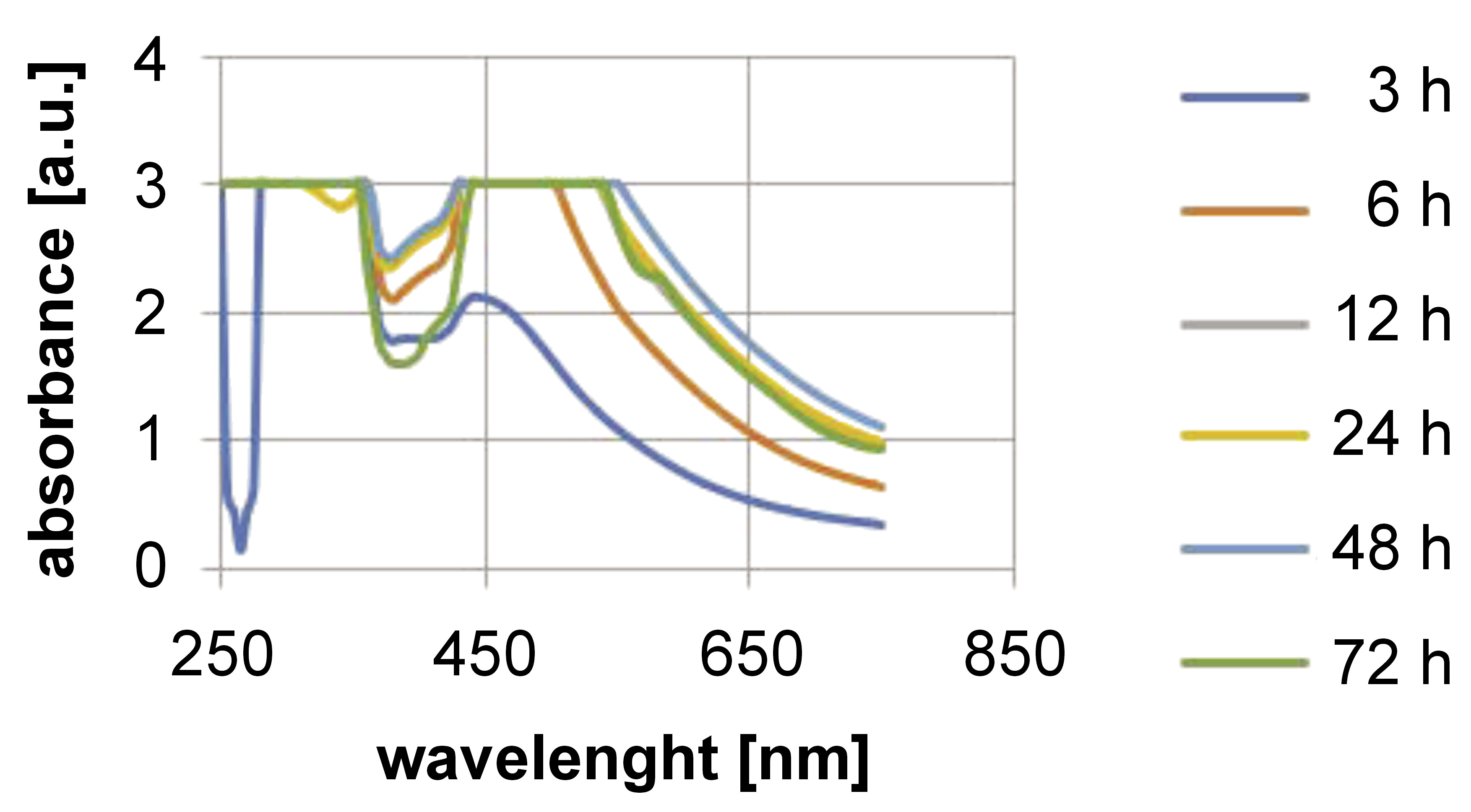 The formation of AgNPs through the reduction of AgNO3 was monitored at different time intervals up to 72 h, between 250 and 700 nm. A transmission electron microscope (TEM) was used to examine the surface morphology.