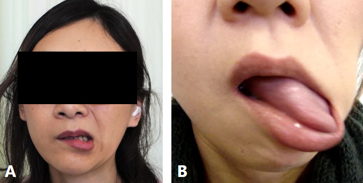 The most prevalent complaint of FSMDs was muscle pain (50%).66 Depression (38%), dysarthria (27.6%), and masticatory disturbances (15.5%) were also observed.66 Although specific electrophysiological tests or a gold standard for diagnosis are absent, functional movement disorders should be diagnosed with clinical certainty based on the available criteria.65 Functional movement disorders often exhibit distinctive clinical features in the orofacial region, such as tonic spasms involving the lip, eyelids, perinasal region, and forehead.64, 66 The most common phenotype is tonic jaw deviation involving ipsilateral downward and lateral lip pulling, observed in 84.3% of patients with facial functional movement disorders.64 Uni- or bilateral orbicularis oculi and platysma contraction are also frequently associated.63 Common patterns of FSMDs included jaw deviation (74.1%), jaw closing (50%), lip pulling (34.5%), and tongue movement (31%).65 The classic phenotype (unilateral lip pulling and jaw deviation) was observed in 44.8% of patients (Figure 2A).66 Characteristic features of FSMDs, such as repeated rapid jaw (lateral or tapping) and/or tongue movements, were observed in 22.4% of patients (Figure 2B).67