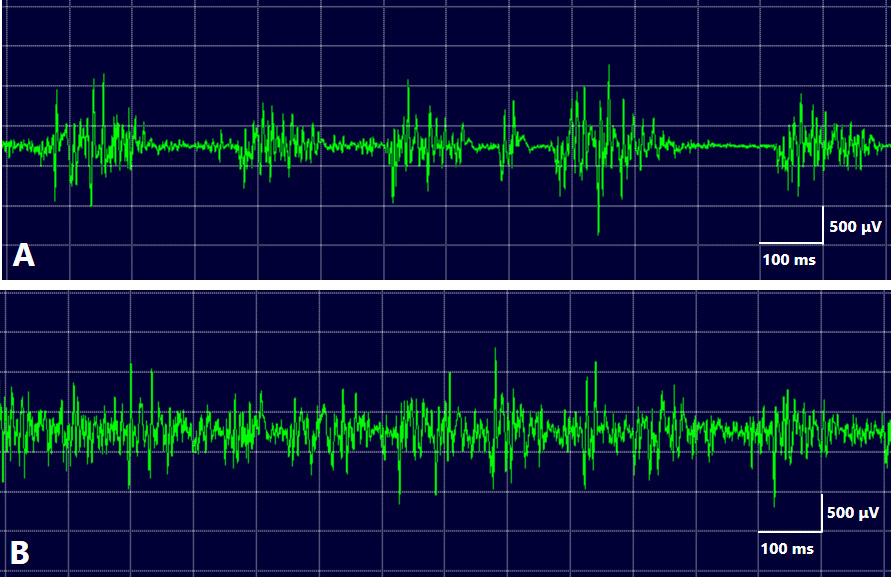 The EMG data of HMS showed irregular bursts of motor unit potentials correlated with twitches or spasms. Individual motor unit potentials showed high-frequency activity, up to 200 Hz, suggesting a peripheral origin of the abnormal activity.73 Unlike unilateral OMD, HMS does not exhibit a co-contraction or overflow phenomenon. Masseter reflexes were either absent or delayed in all examined patients. A distinctive electrophysiological finding of HMS was the absence of silent periods during spasms (Figure 3). Complete efferent block to the muscles is an exceptional and unique finding in HMS.76 Based on these electrophysiological findings, HMS is hypothesized to originate from either the motor root or the motor nucleus of the trigeminal nerve.74, 75, 76